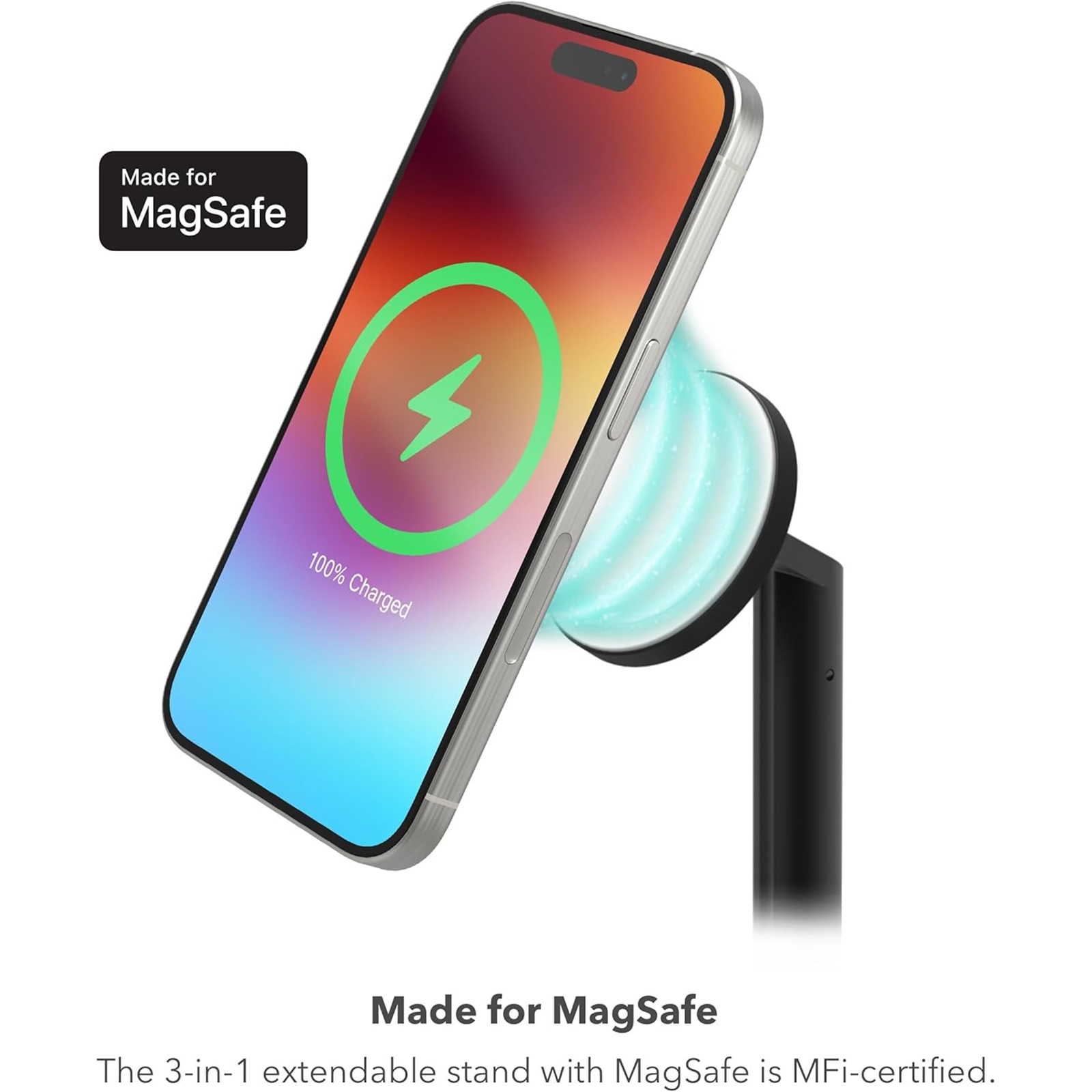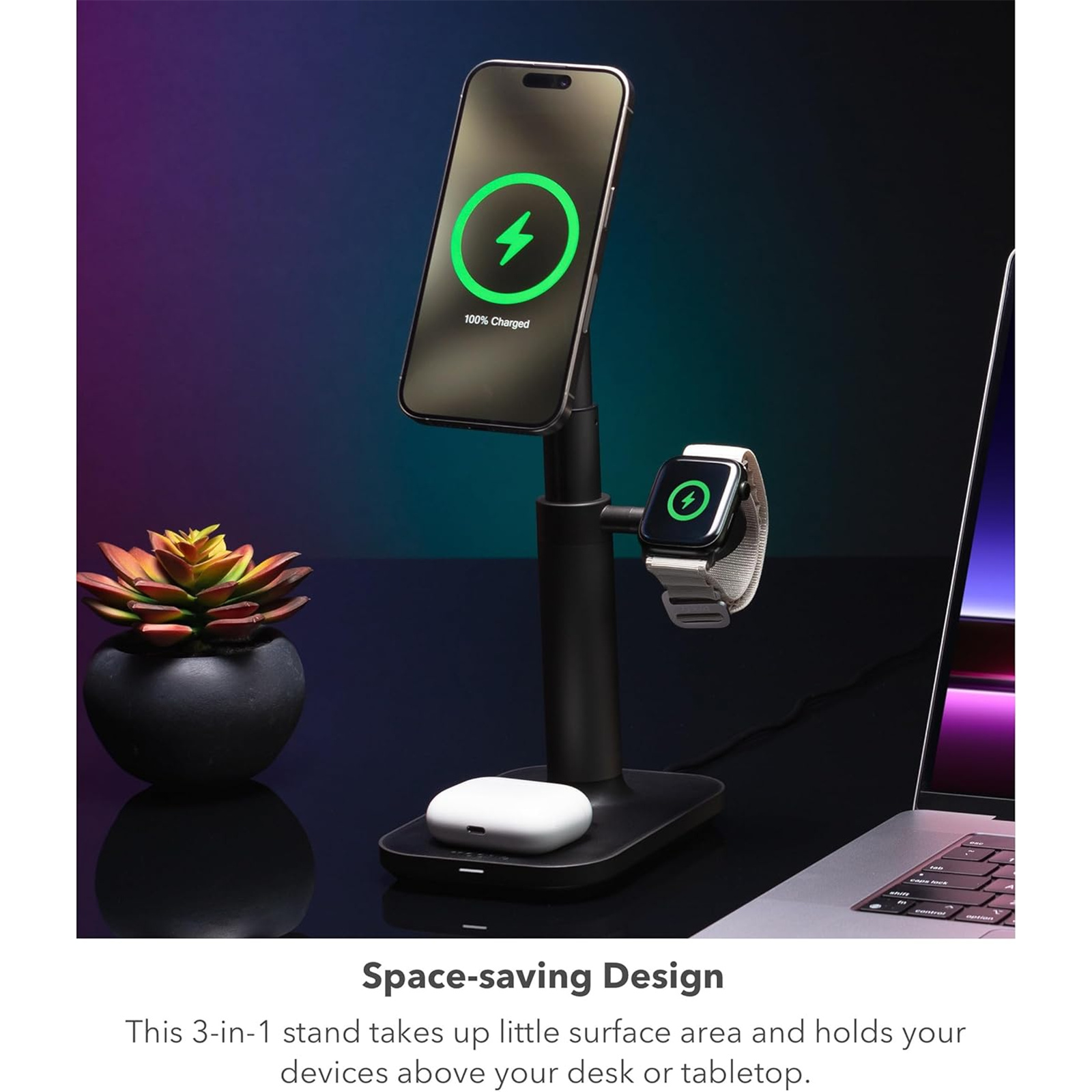 Space-saving Design: The 3-in-1 extendable stand with MagSafe takes up little surface area and holds your devices above the clutter of a desk or tabletop.