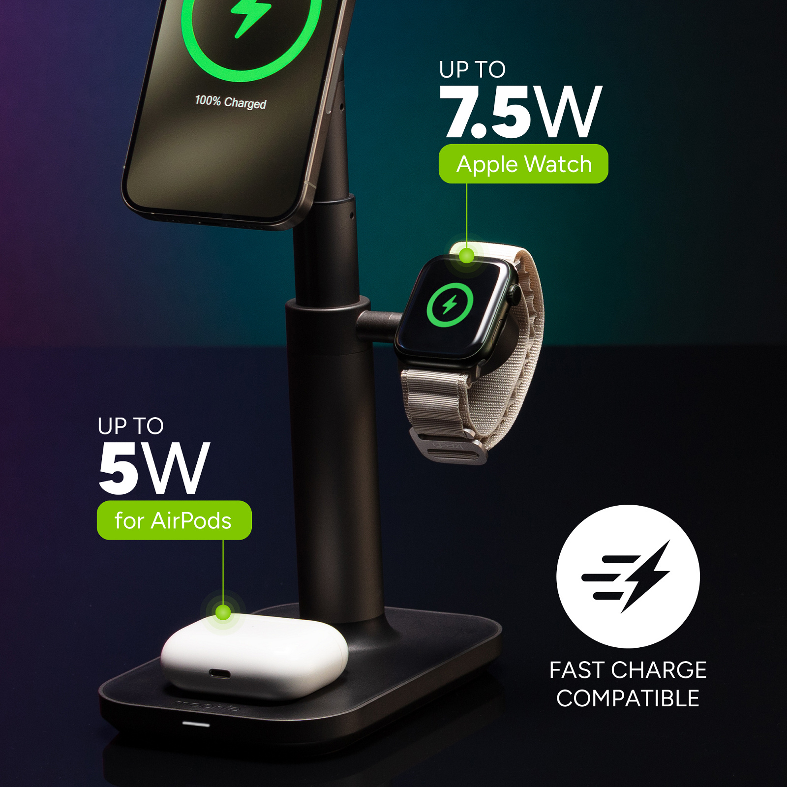 Fast Wireless Charging: This MFi-certified 3-in1 charger delivers up to 15W of fast-charging wireless power to your Apple devices.