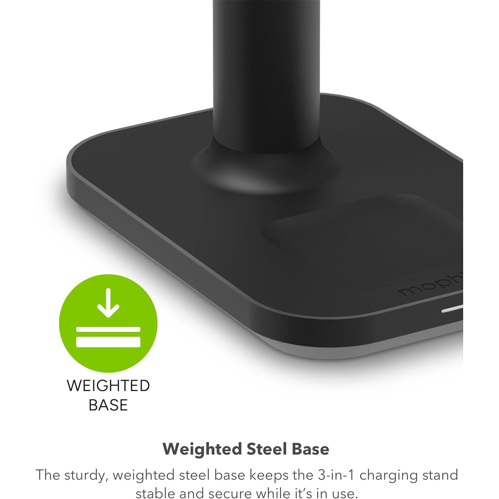 Weighted Steel Base: The sturdy, weighted steel base keeps the 3-in-1 charging stand stable and secure while it's in use.