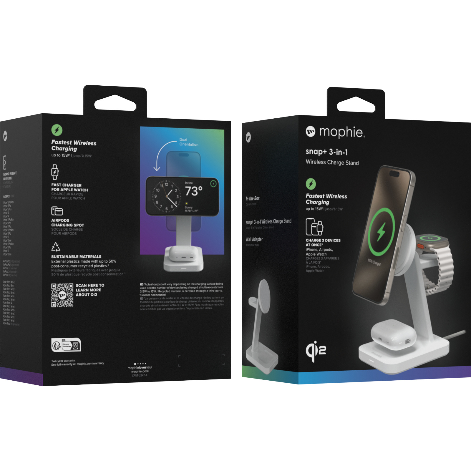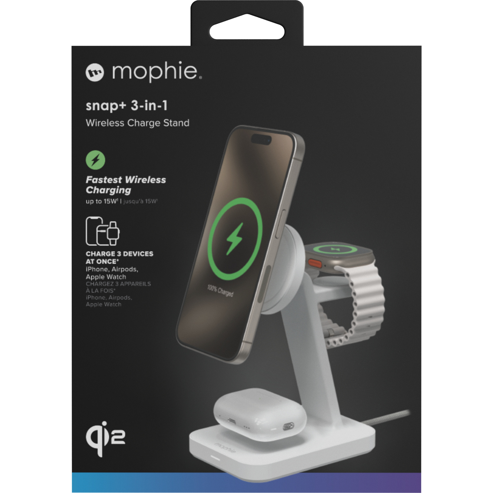 Charge your phone, Apple Watch, and AirPods with the snap+ 3-in-1 wireless charge stand. This Qi2-certified wireless charger delivers up to 15W of fast-charging power to your phone. The adjustable charging pad holds your phone magnetically, in landscape or portrait mode. The magnets ensure precise alignment for an optimal charge that begins on contact.