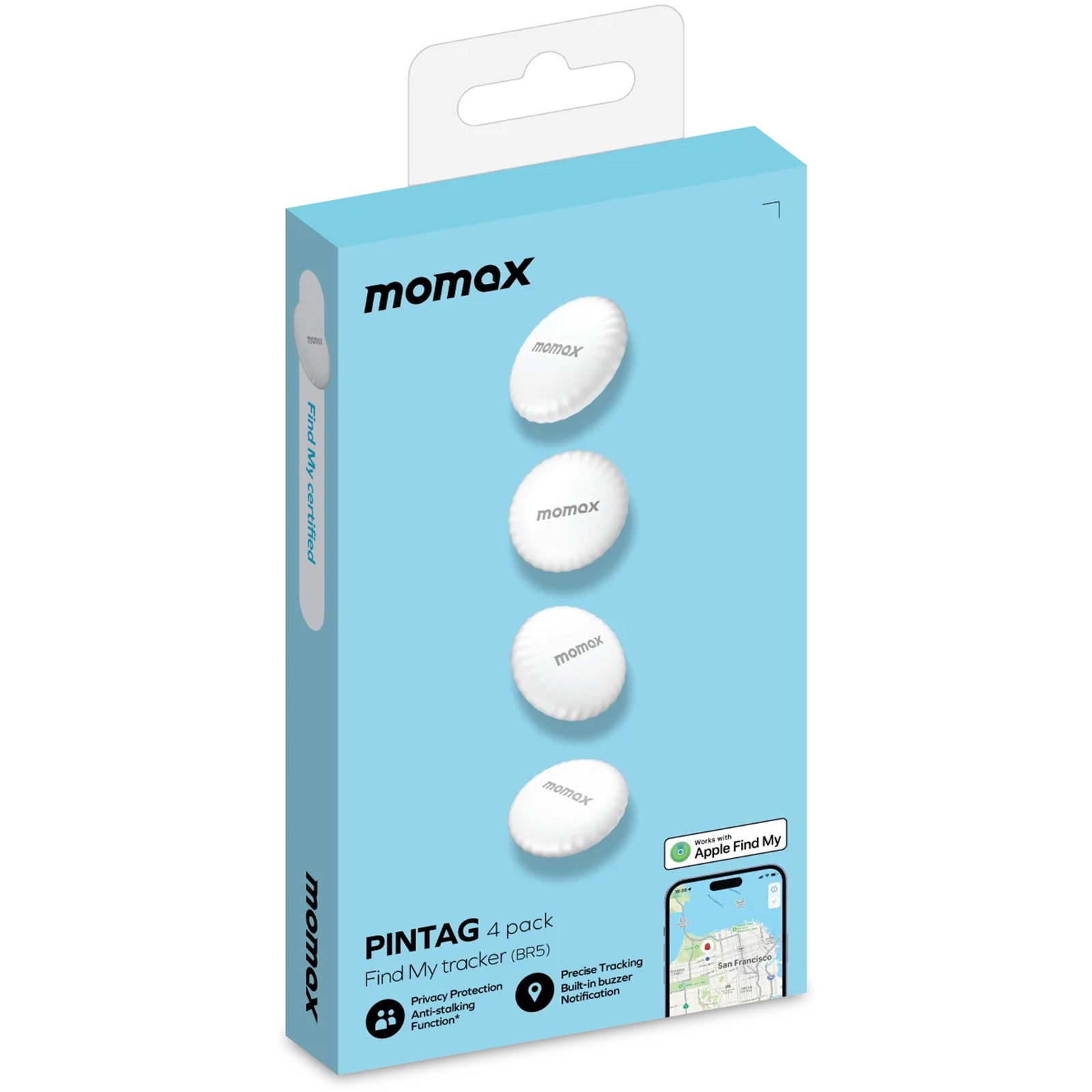 Momax PinTag Apple Find My Bluetooth Tracker (4 Pack) - White - Apple Find My Certified - Compatible with Apple iPhone / iPad / iMac / MacBook - Real-time Tracking - Ultra-long Battery Life - Privacy Protection with Anti-Stalking Function
