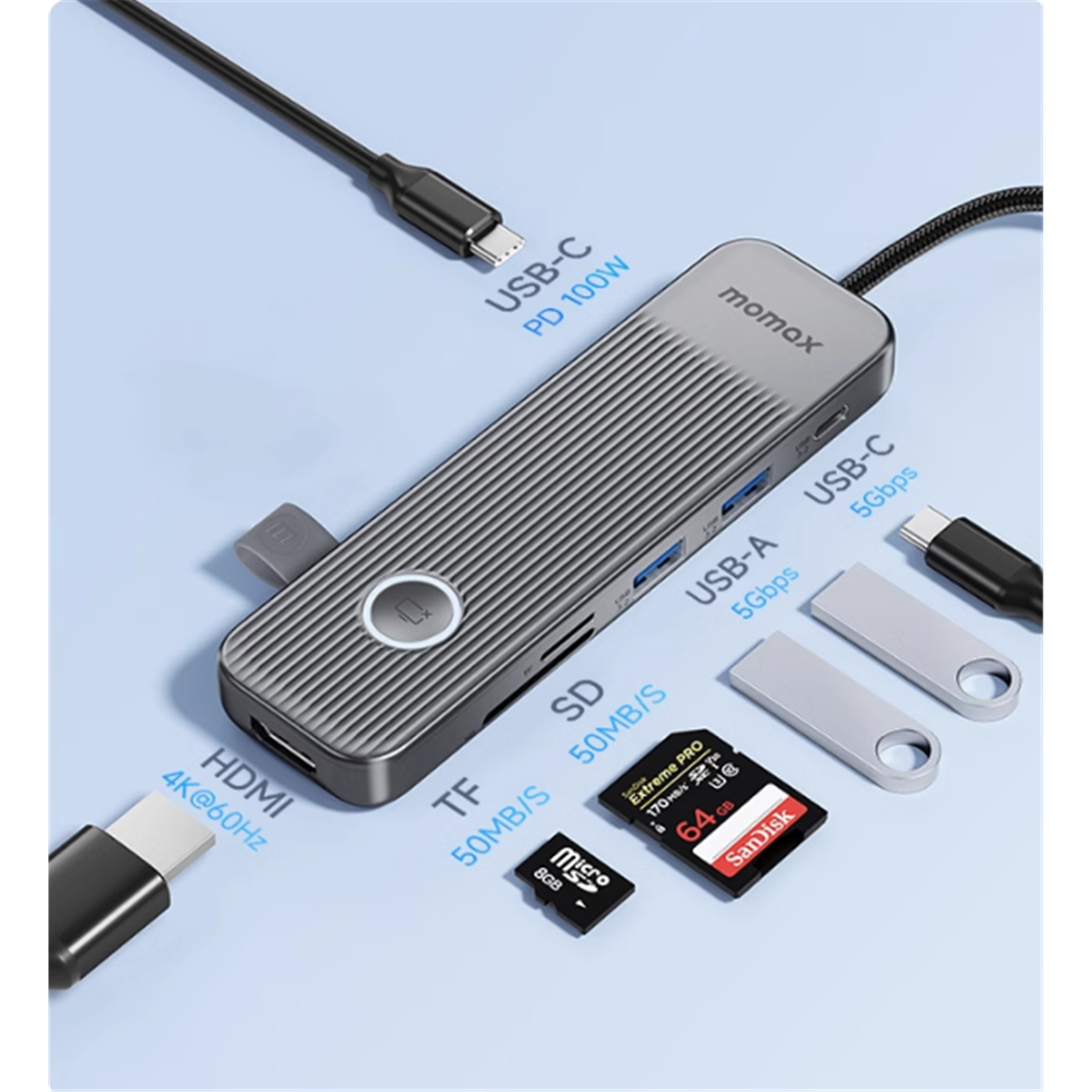 Momax USB-C 7 in 1 100W Power Delivery Hub - Spacy Grey Support 100W PD3.0 Fast Charing - USB3.2 Gen1 High-Speed Transmission - 1x USB-C - 2x USB-A - 1x (4K 60Hz) HDMI - 1x SD Slot - 1x TF Card Slot