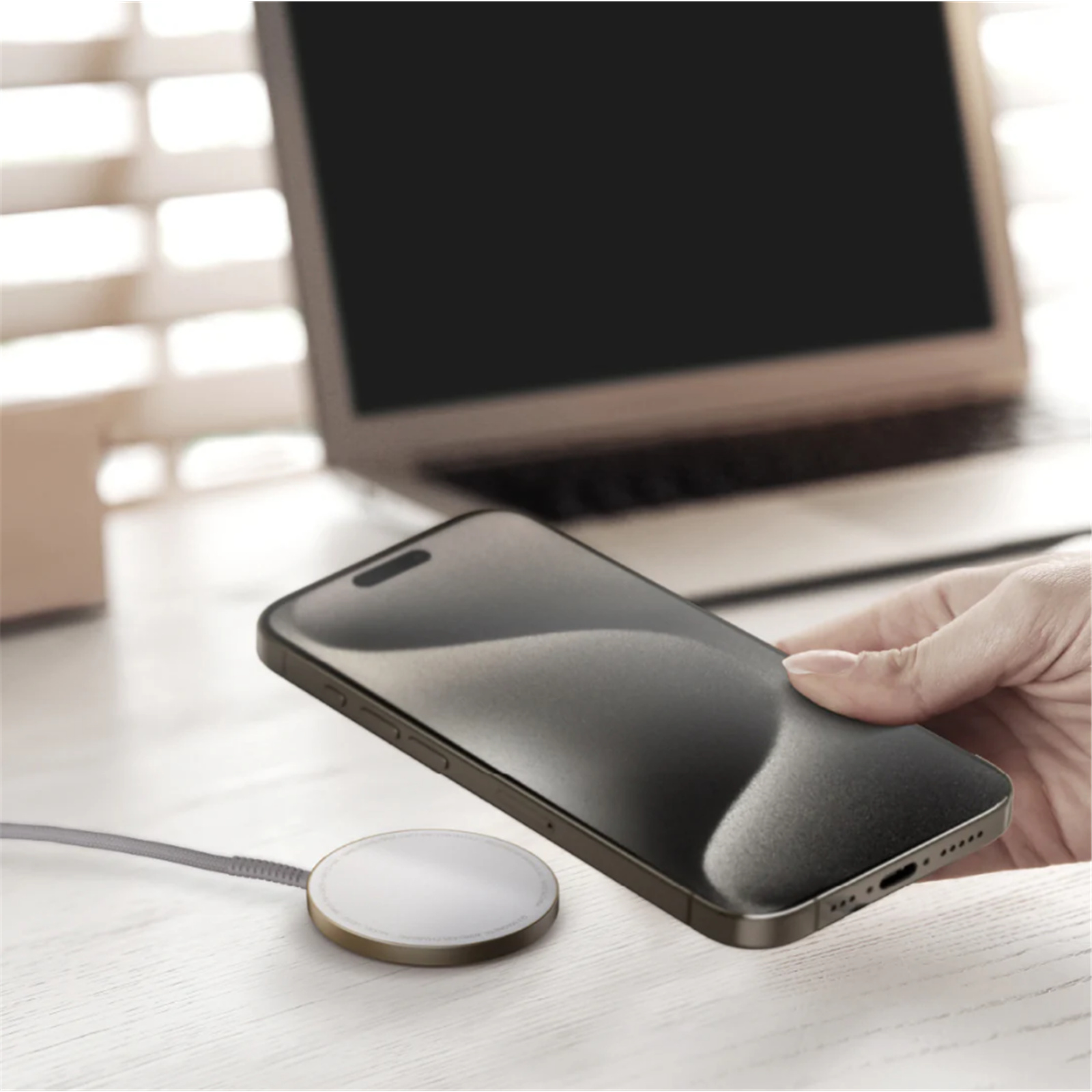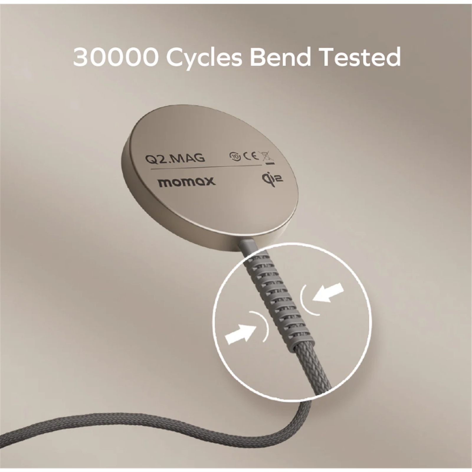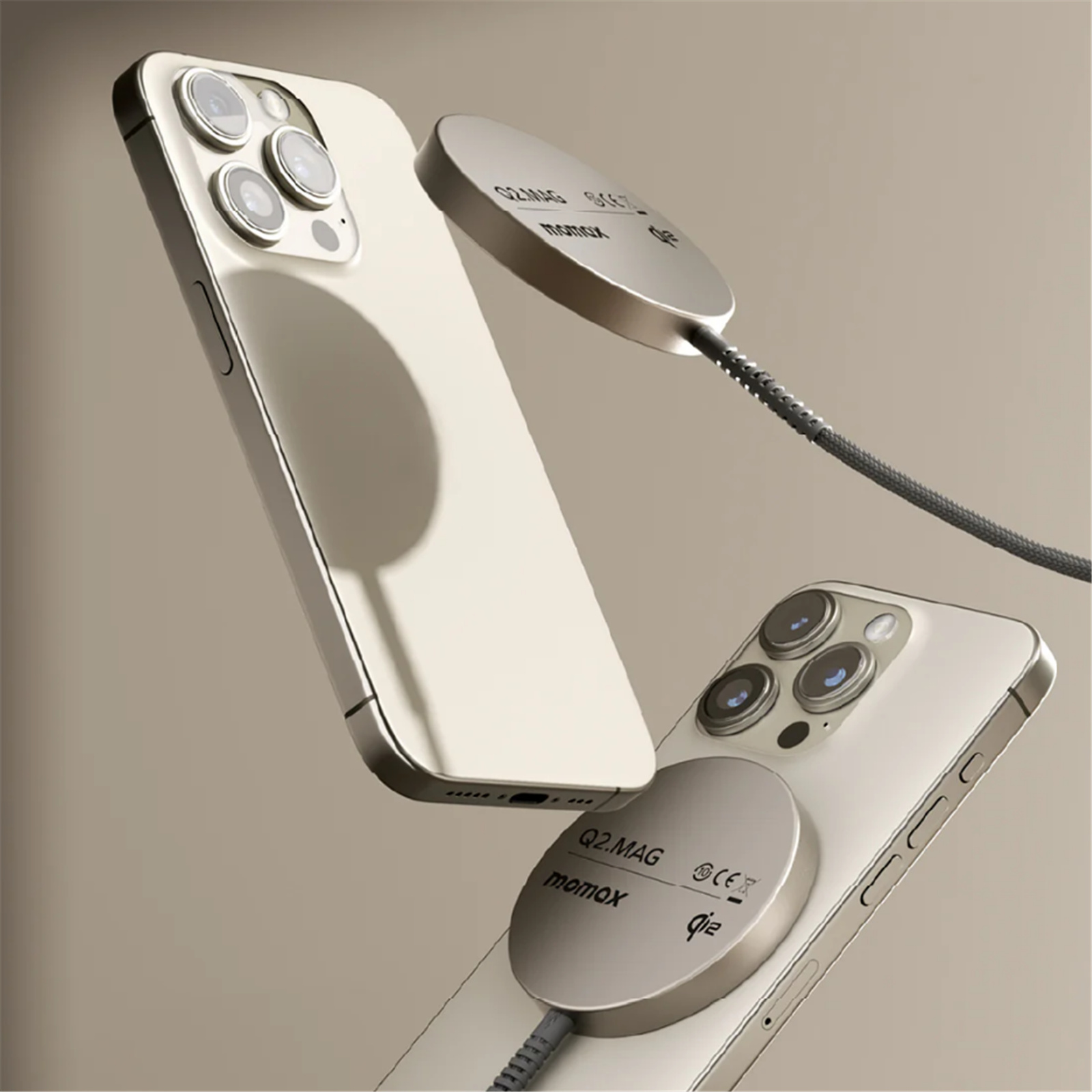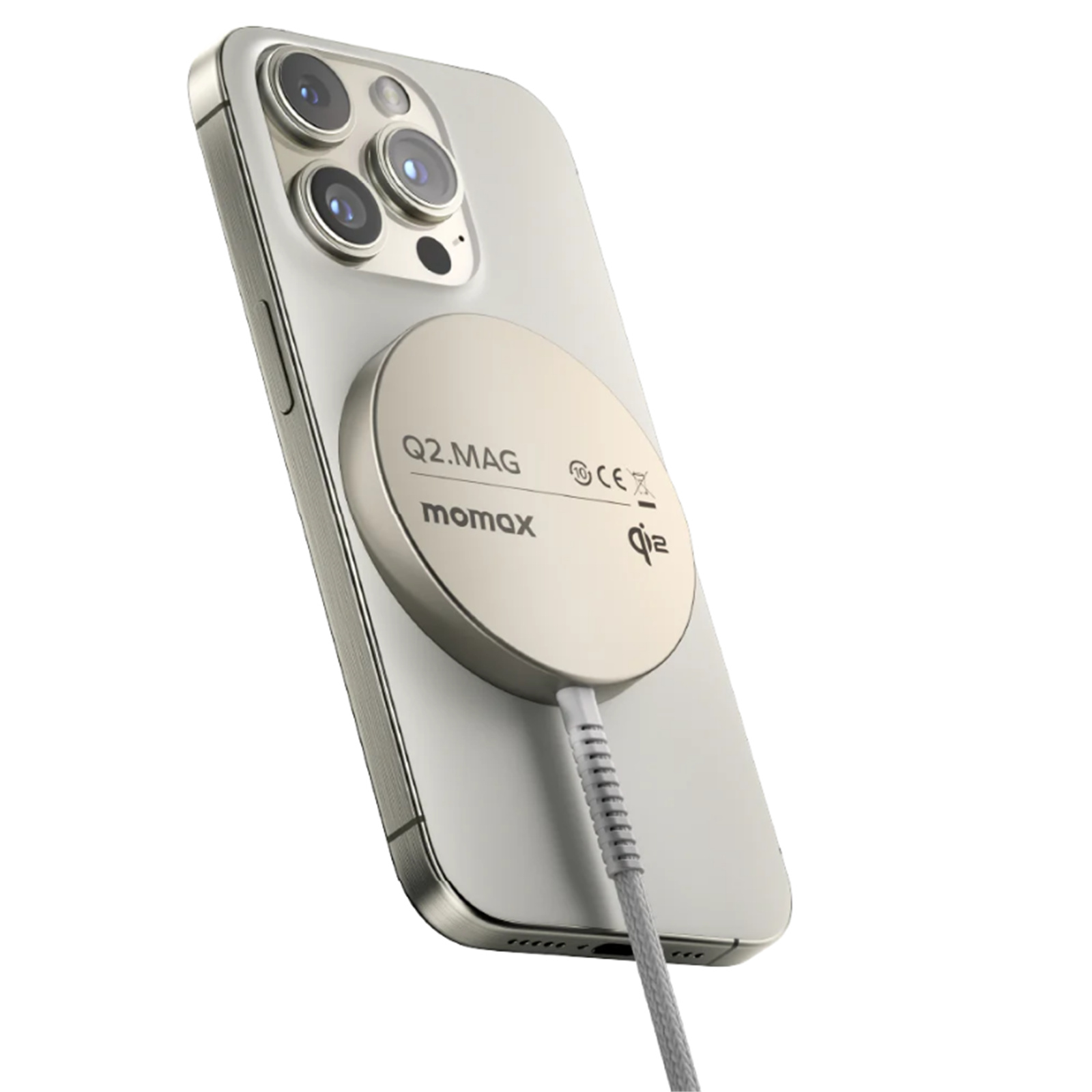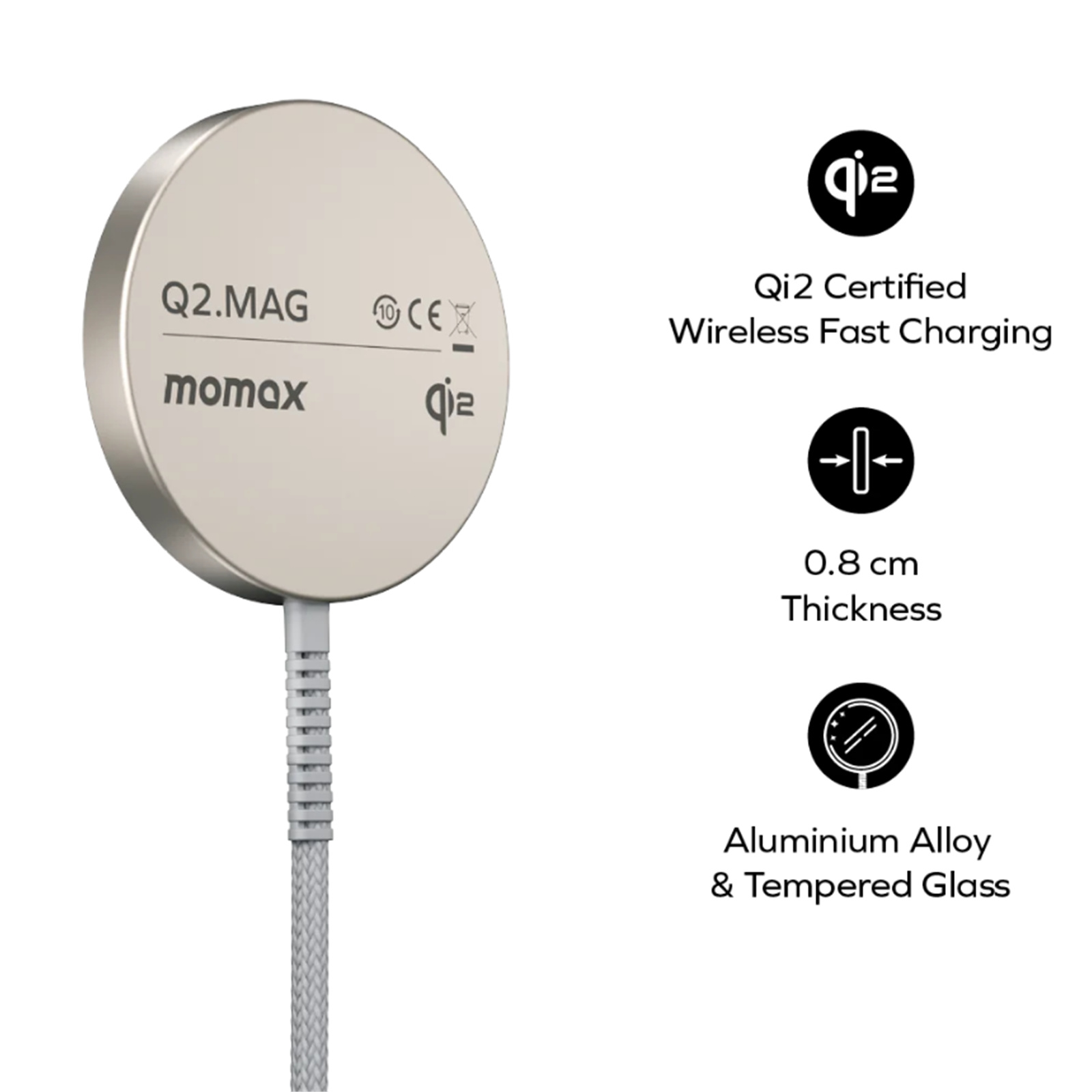 Momax 1.5m 15W Wireless Qi2 Magnetic Wireless Charger - Titanium - Apple MagSafe Compatible, Qi2 Certified for up to 15W Wireless Fast Charging iPhone 16/15/14/13/12, Aluminum Alloy & Tempered Glass Construction