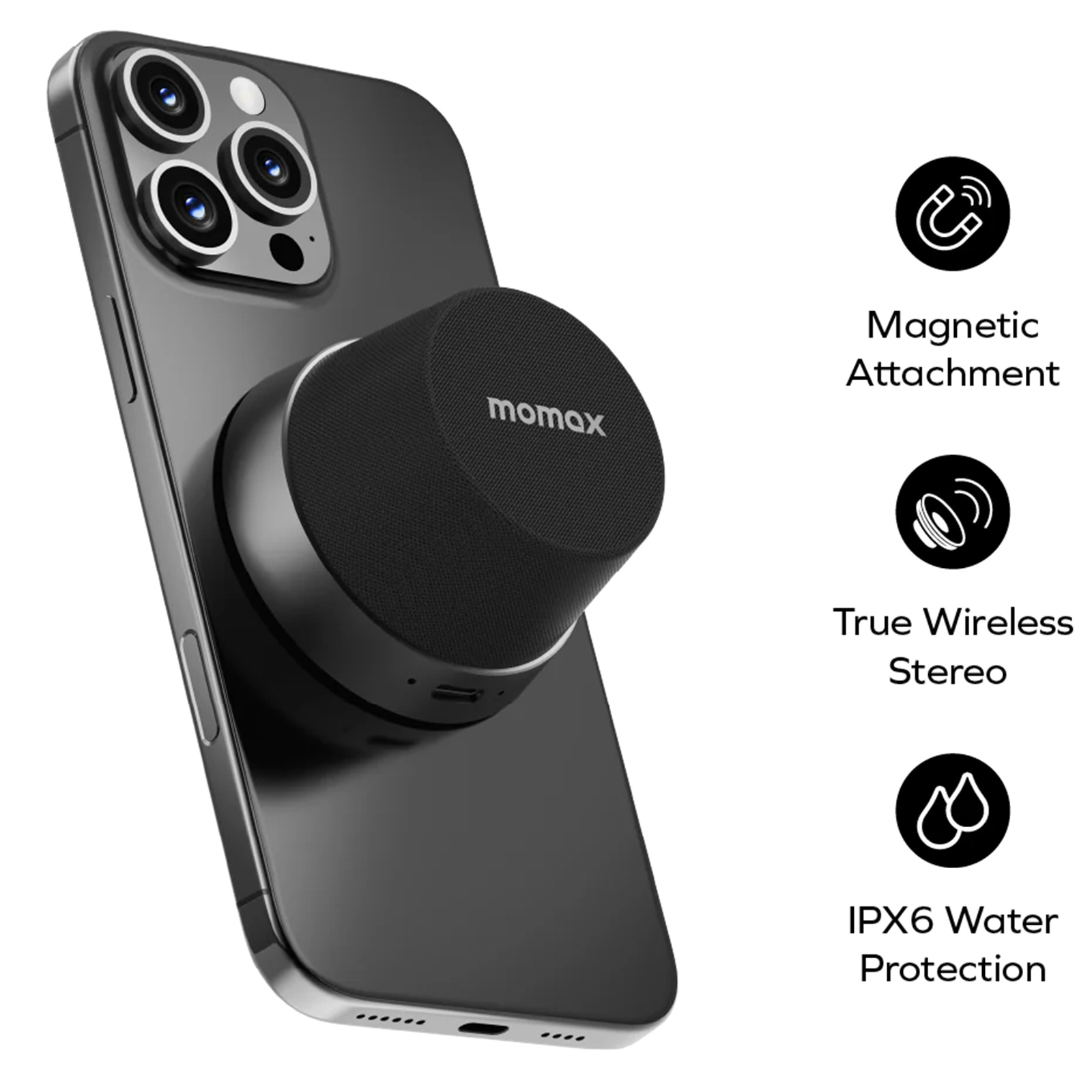 Momax 2 in 1 Magnetic Portable True Wireless Speaker Phone Stand - Black - IPX6 Water Resistant, Magnetic & Compact Attachment Design, Fit For iPhones with Magsafe or Magnetic Phone Cases, Double as a Phone Stand