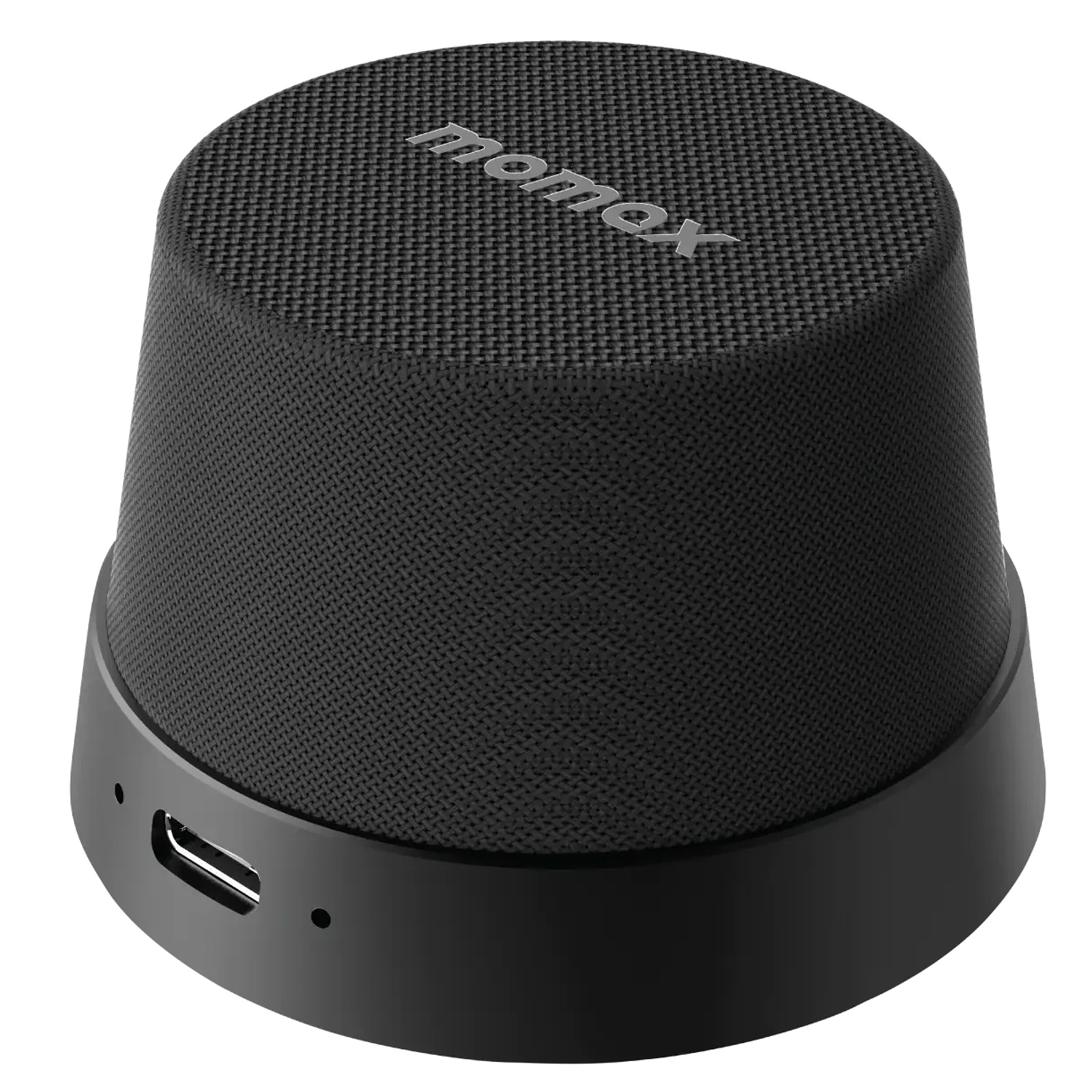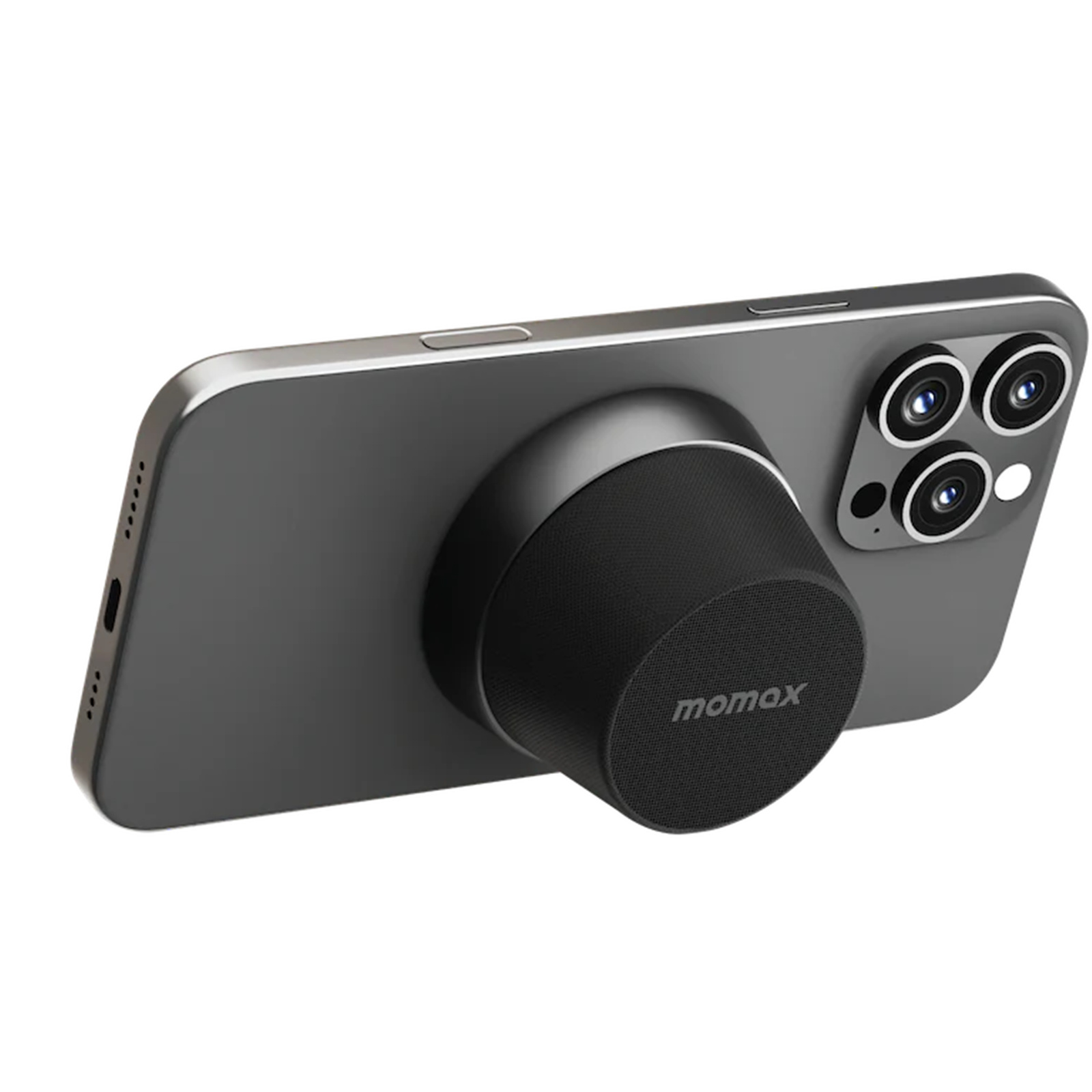 Momax 2 in 1 Magnetic Portable True Wireless Speaker Phone Stand - Black - IPX6 Water Resistant, Magnetic & Compact Attachment Design, Fit For iPhones with Magsafe or Magnetic Phone Cases, Double as a Phone Stand