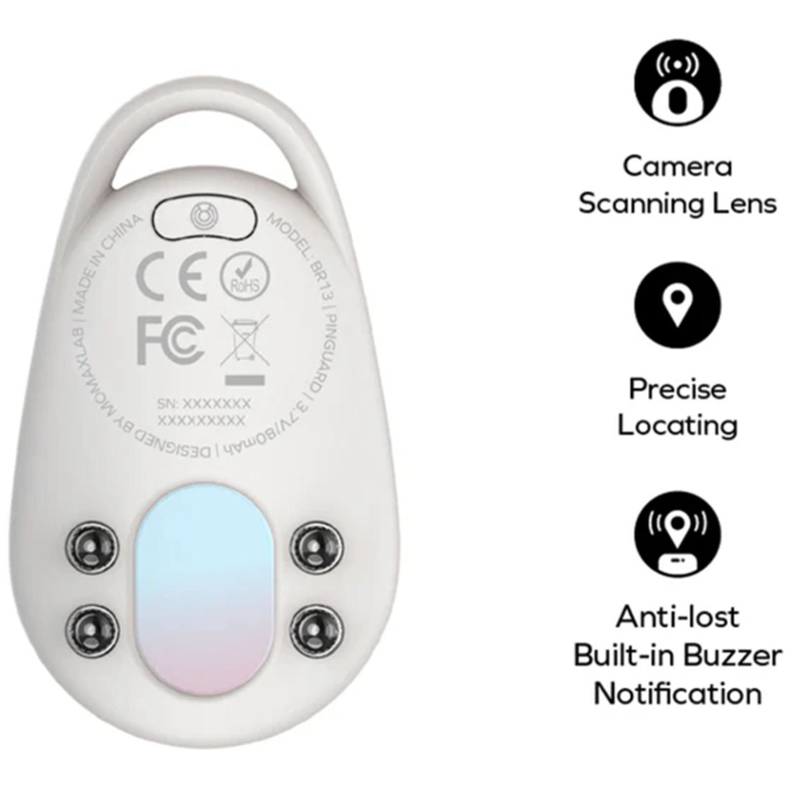 Momax Pinguard Apple Find My Bluetooth Tracker with Anti-Spy Camera Detector - White - Apple Find My Certified - Hidden Camera Finder With Red Light - Built-in USB-C port for charging- Features emergency two-way alarm on device and phone