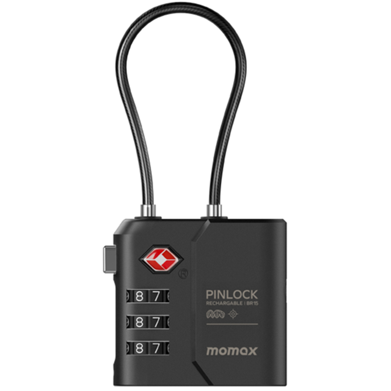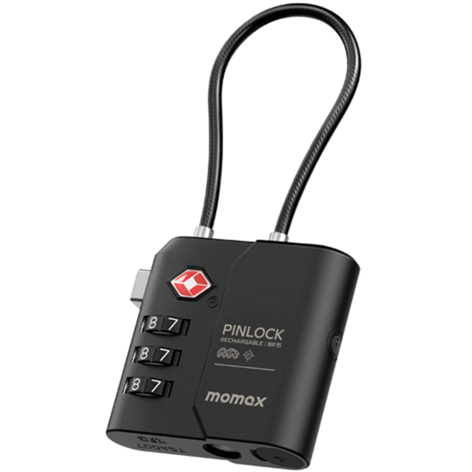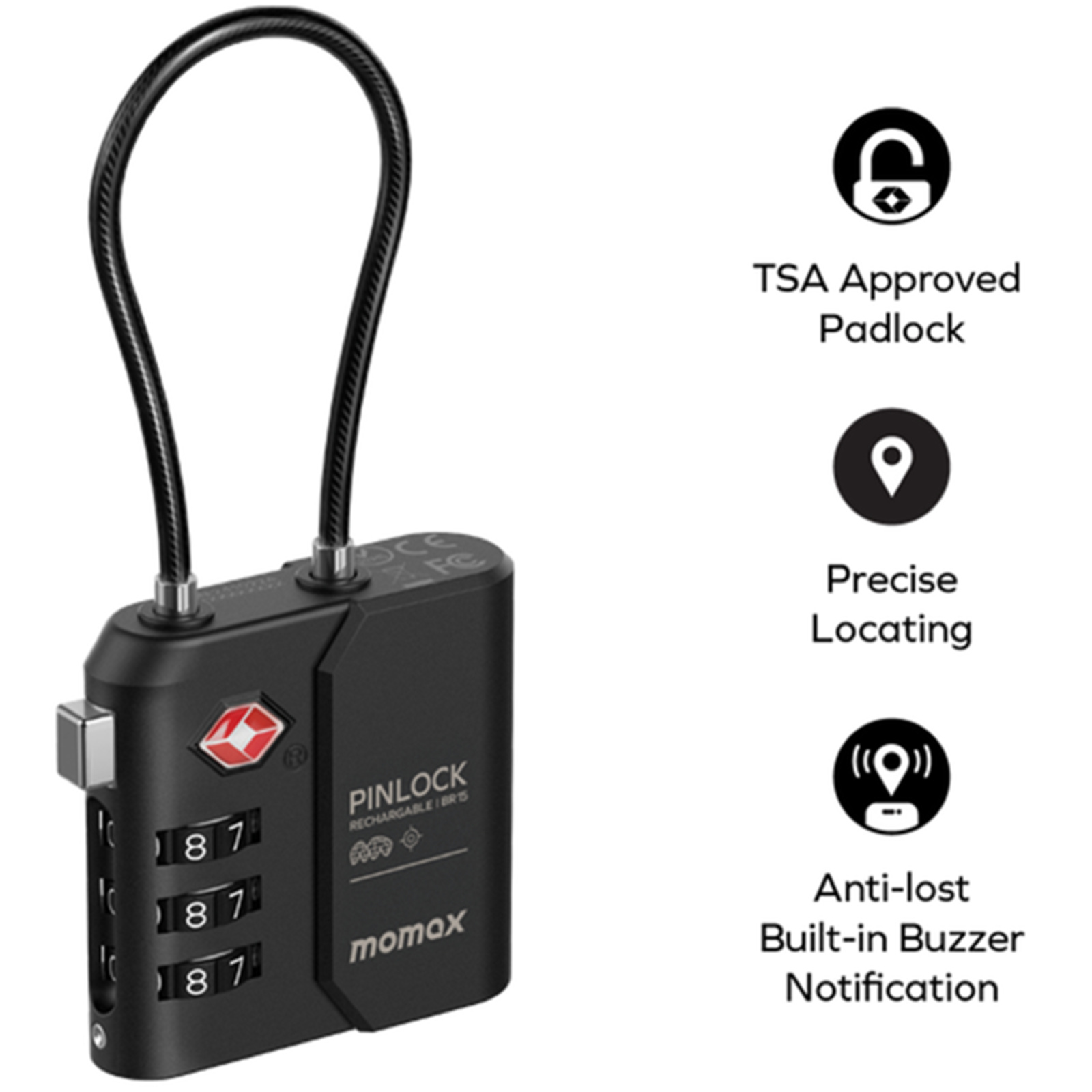 Momax PinLock Apple Find My Bluetooth Tracker with TSA Padlock - Black - Apple Find My Certified - TSA approved luggage lock - Built-in USB-C port for charging - With instant lost alarm setting