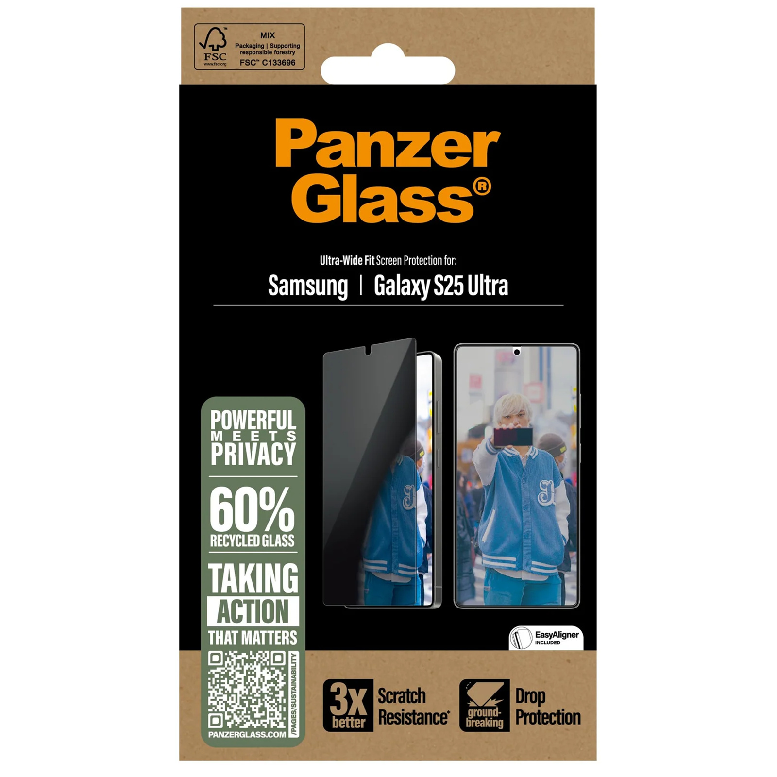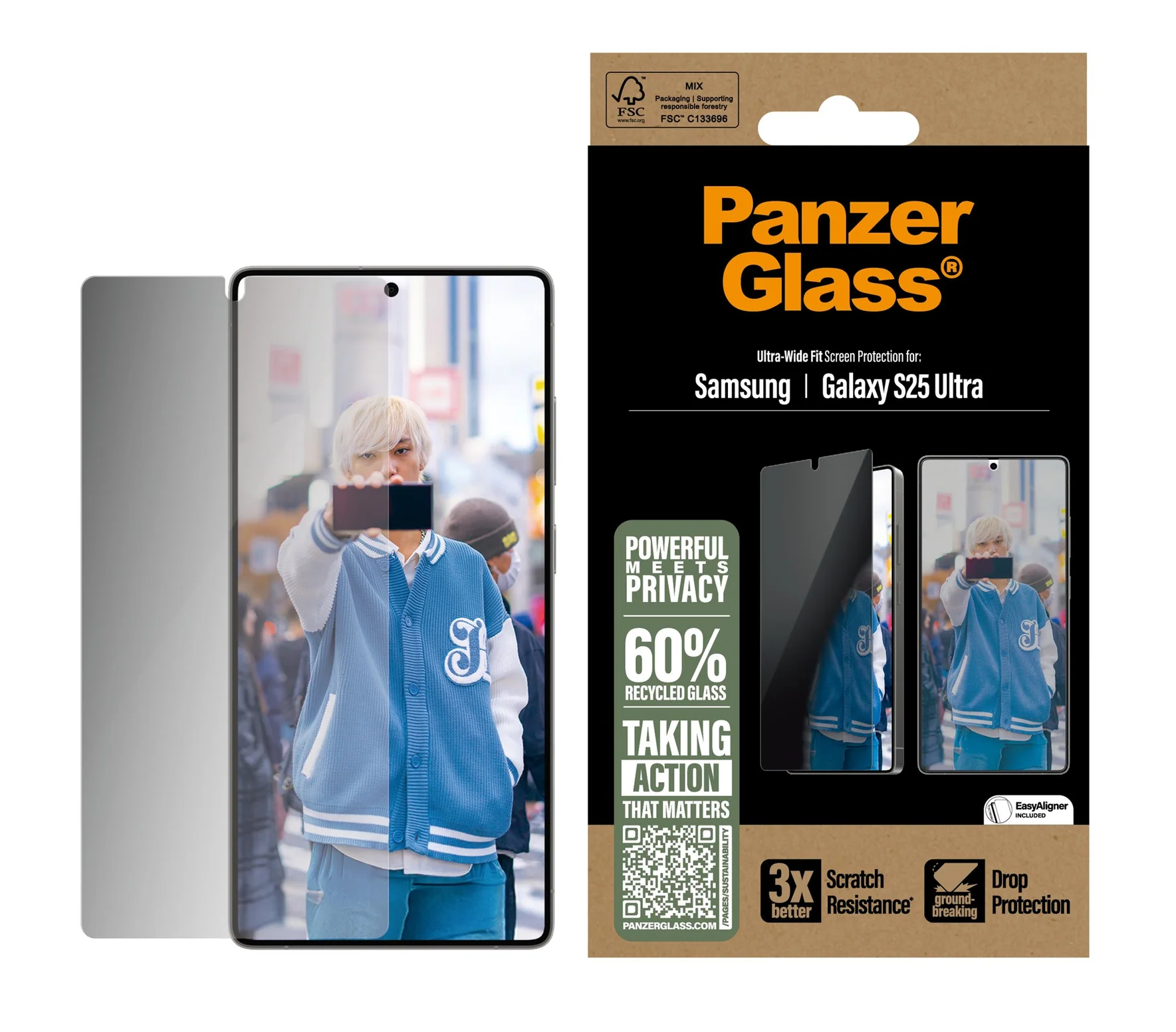 Check out this PanzerGlass® privacy screen protector! Made with 60% recycled glass, it keeps your personal stuff hidden from nosy neighbors on the train, at the coffee shop, or in the office. The privacy filter makes your screen's content invisible to anyone but you. It even has a smudge-free coating that reduces traces of fingerprints and grease and ensures 100% compatibility with your screen's ultrasonic fingerprint reader, so you can be sure that your phone unlocks smoothly every time.