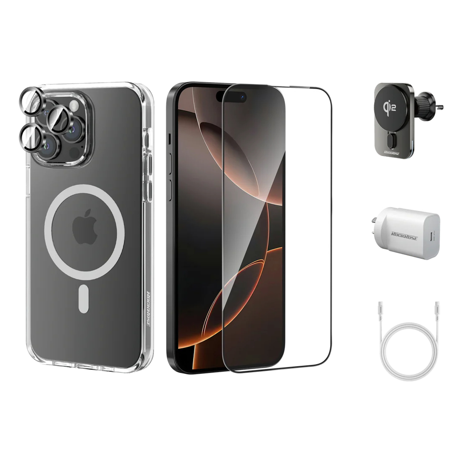 RockRose iPhone 16 Pro ( 6.3" ) 6 in 1 Colletction Kit Includes 30W Power Adaptor - 1M 100W USB-C Cable - Magsafe Wireless Car Charger - Magsafe Phone Case - Screen Protector - Camera Lens Screen Protector