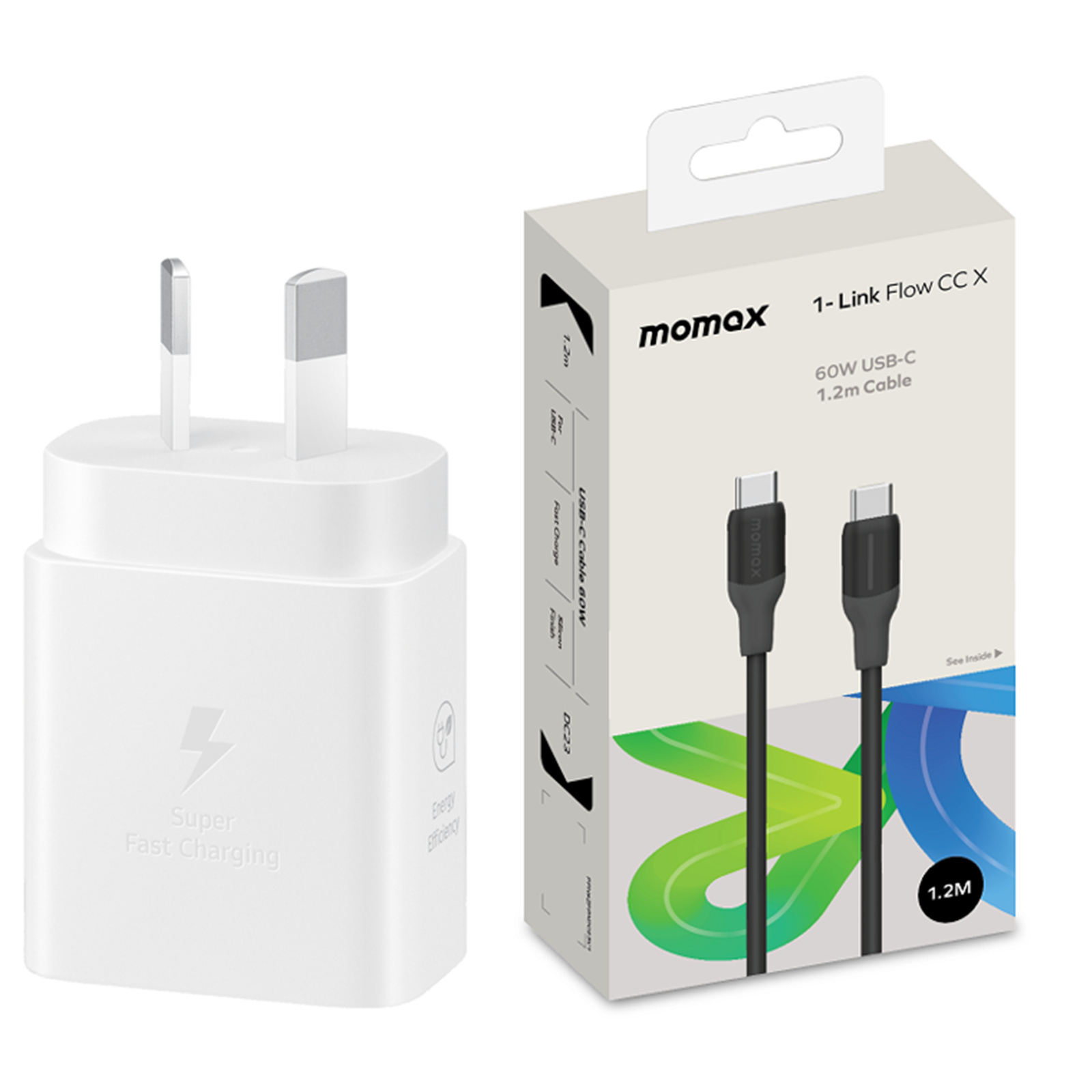 Samsung 25W USB-C PD Fast Charging GaN Wall Charger - White With Momax 1-Link Flow 60W 1.2M USB-C To USB-C PD Fast Charging Cable Black - Support Samsung Super Fast Charge & iPhone PD Fast Charging