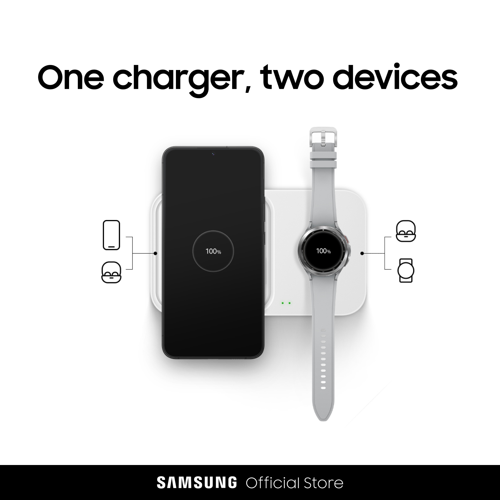 *The right side of this charger is only compatible with Galaxy Watch (Active 1 or later models) and Galaxy Buds products. Mobile phones cannot be charged on this side.
