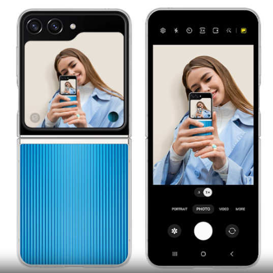 Let Galaxy Z Flip5 experience a fun digital transformation with an interactive card. You can adorn your front screen with unique content - captured in impressive mirror selfies.