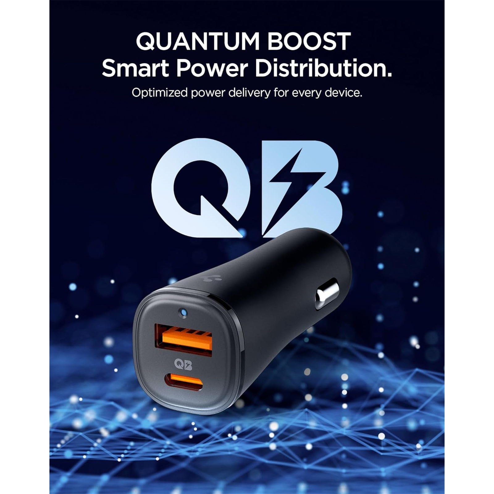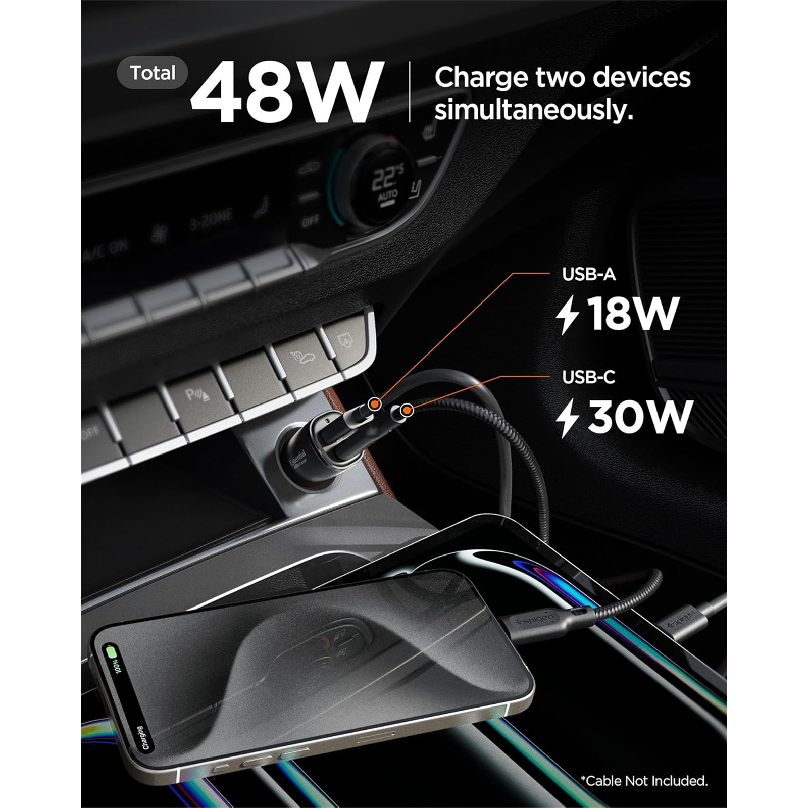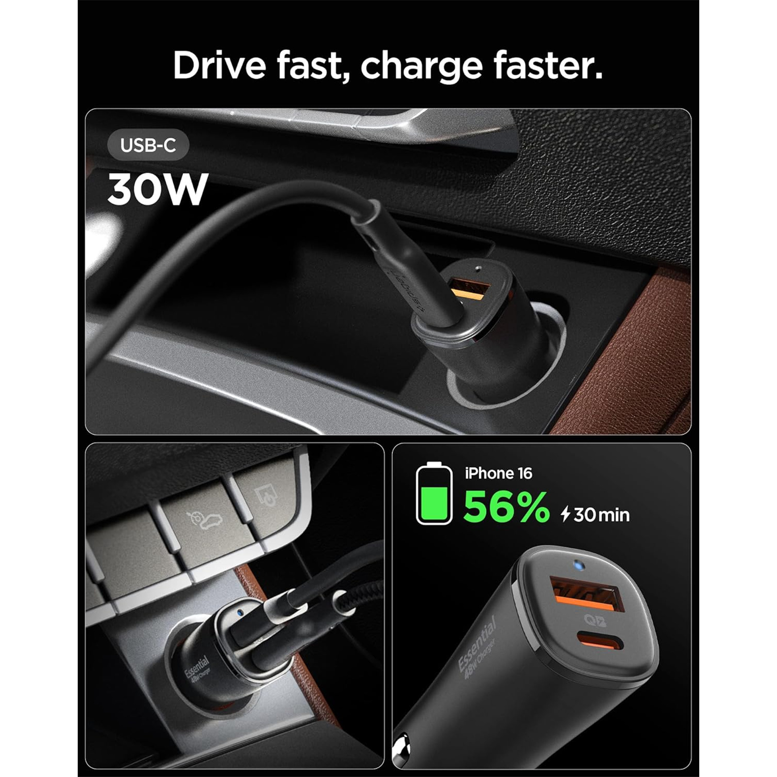 Spigen Essential 48W Dual Output Car Charger - Black- - 30W USB-C &18W USB-A Output - Fast Charging Apple,Samsung Devices - Compatible PD/PPS/Qualcomm Fast Charge Protocols