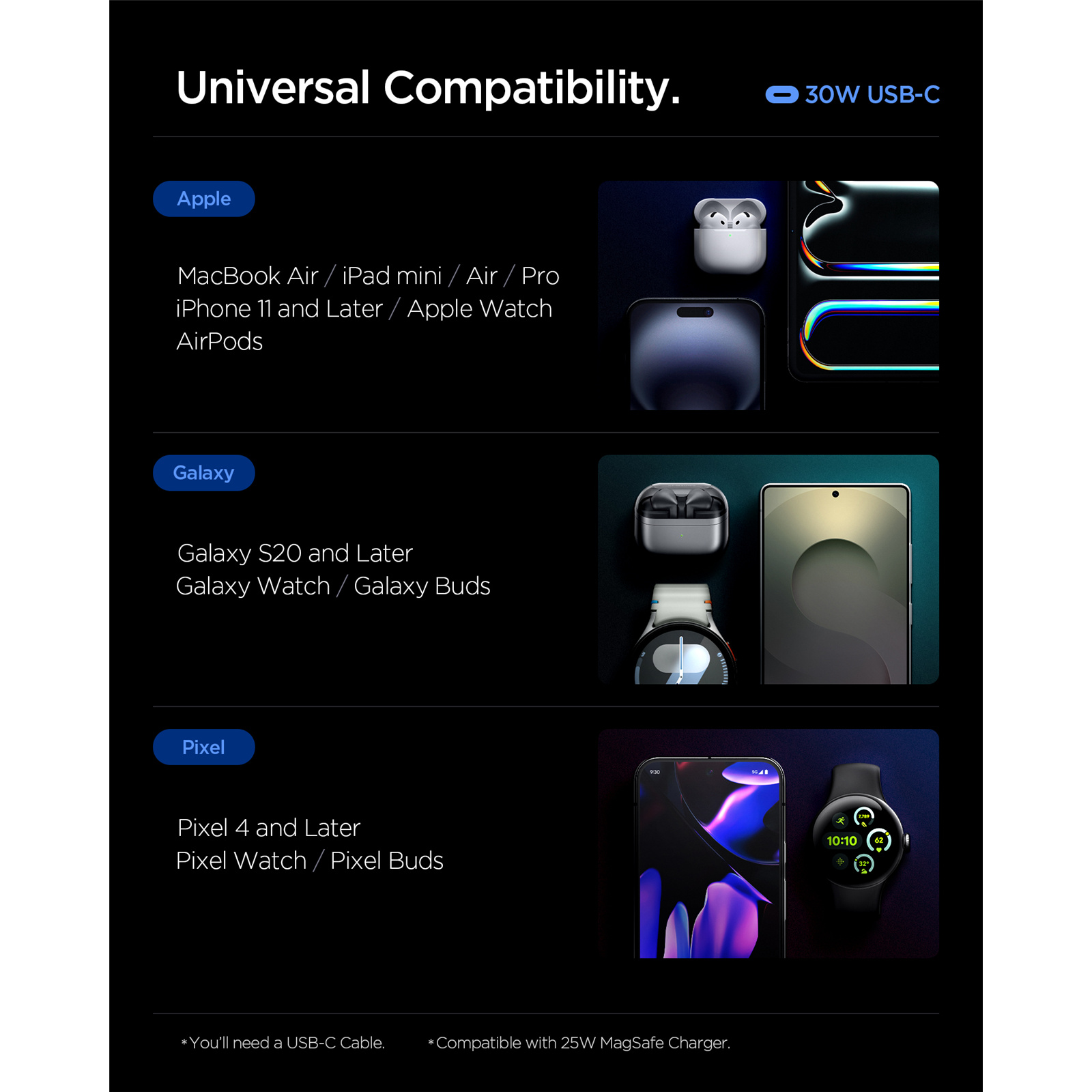 - Universal Compatibility supports fast charging for Apple, Samsung, and other USB-C devices.