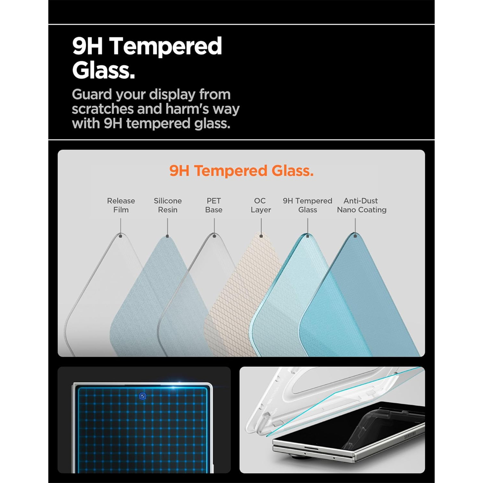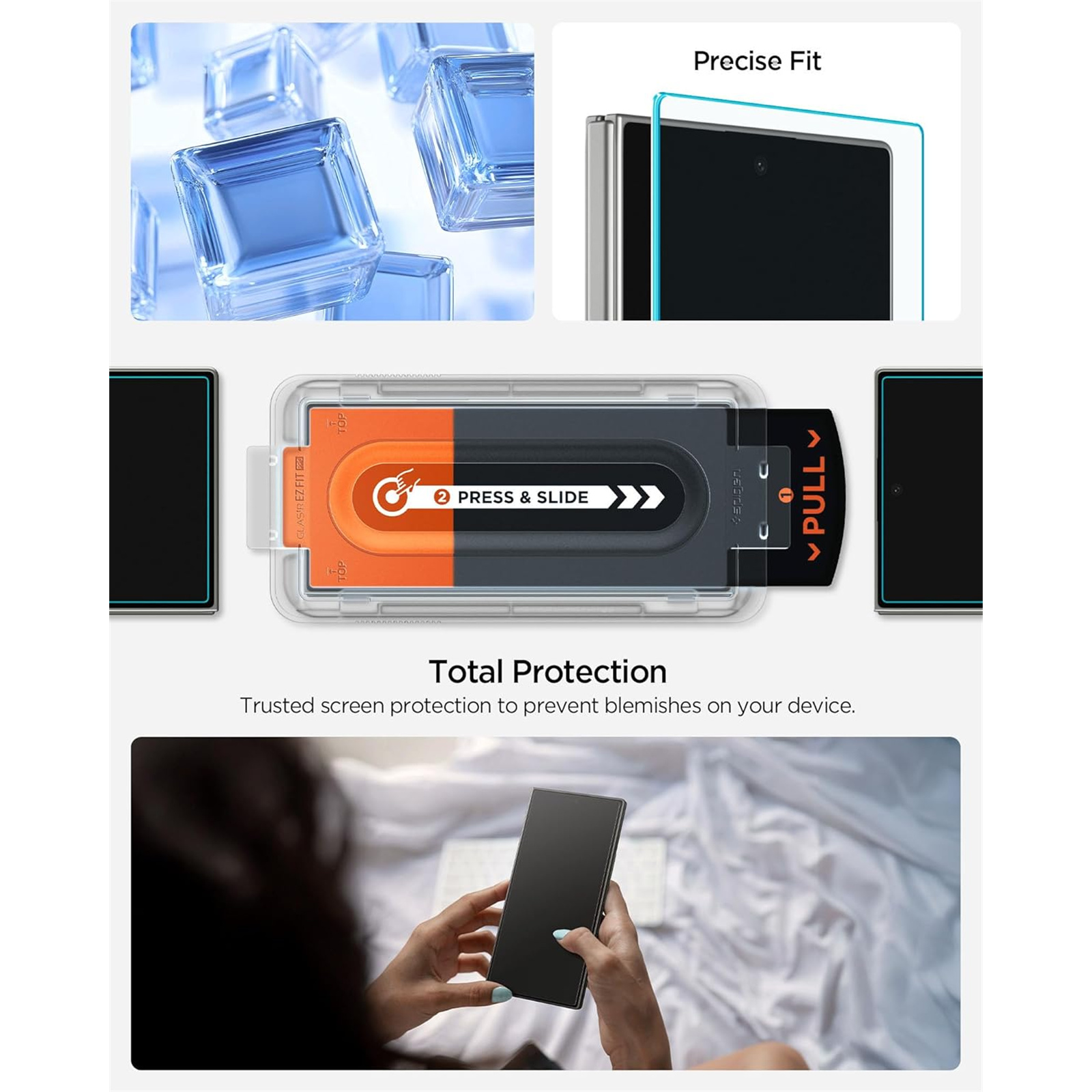 Spigen GLAStR EZ FIT PRO HD Tempered Glass Screen Protector for the outer Front Cover Screen of Samsung Galaxy Z Fold7 comes with an innovative tray designed to eliminate the time wasted to achieve the greatest alignment. Simply place the tray over the phone, press the center & watch the glass adhere in place. Shield the screen with Premium Reinforced Tempered Glass with 9H hardness, absolute Clarity, NO LOSS in Touch Screen Sensitivity (Feels like touching the original screen).