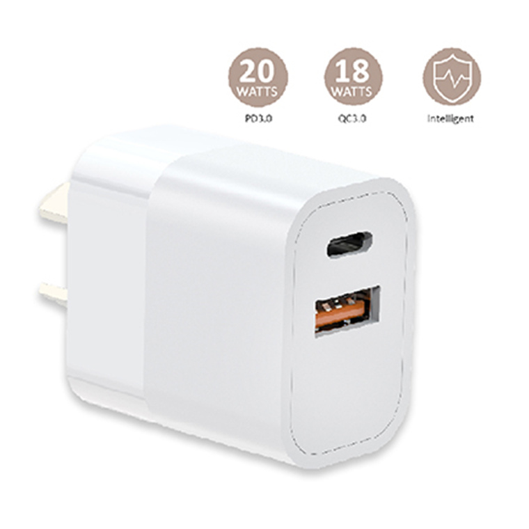 The included wall charger packs both a USB-C PD port (20 W) and a USB-A QC3.0 port (18 W). The USB-C delivers up to 20 W for rapid charging of compatible devices, while the USB-A offers Quick Charge support-enabling fast charging of two devices simultaneously with the charger intelligently managing power distribution.