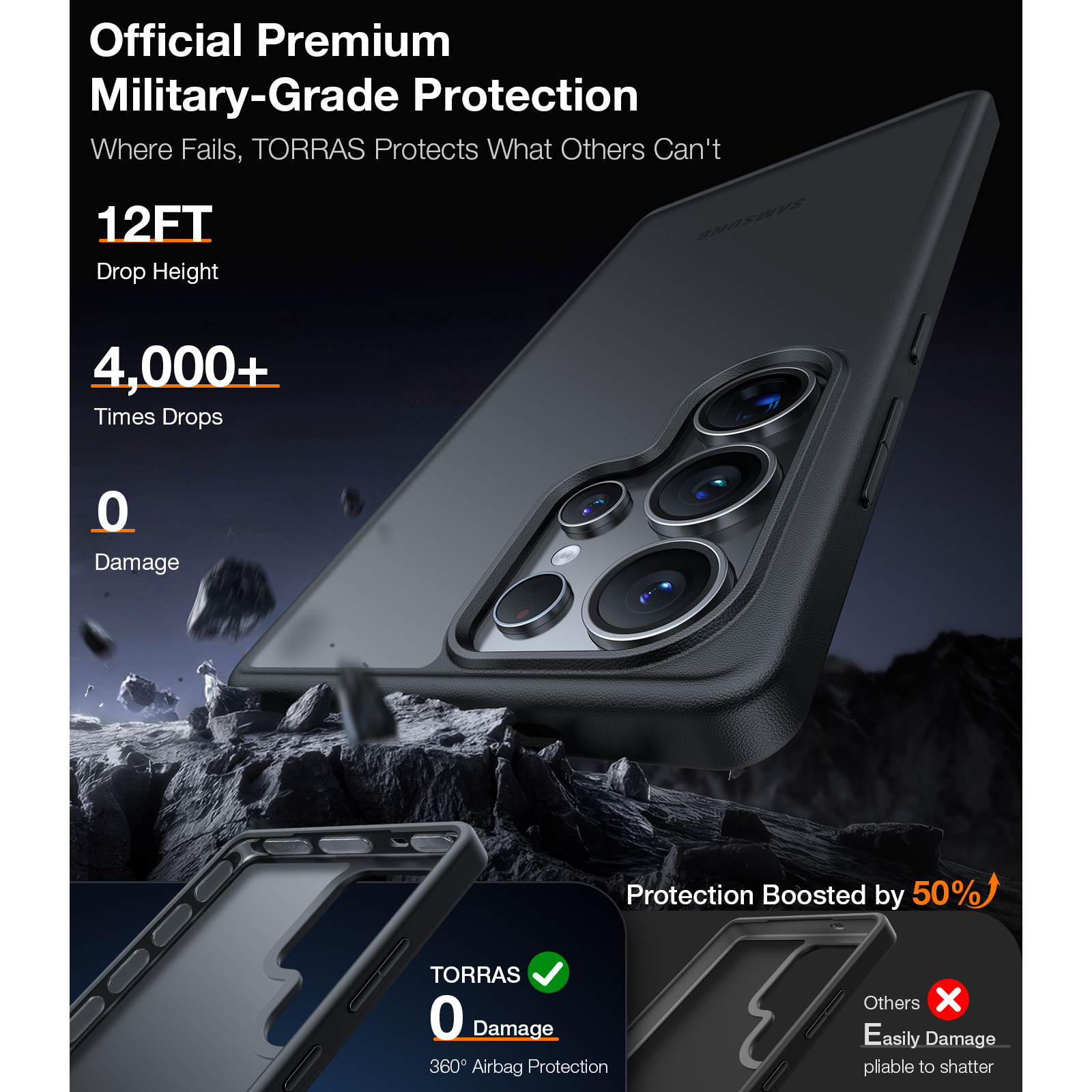 Torras Galaxy S25 Ultra 5G Guardian Case - Black 3.6m Military Grade Drop Tested - Translucent Slim
