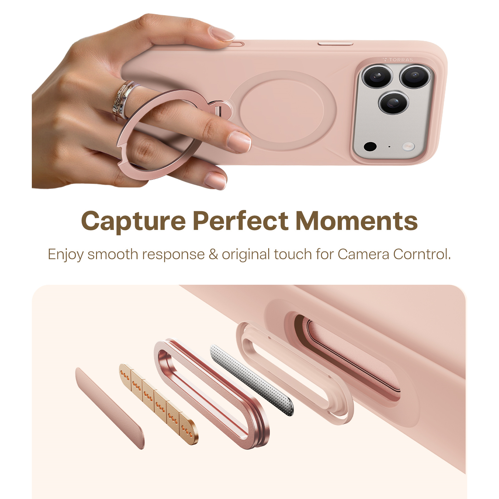 Torras iPhone 17 Pro (6.3") 2025 Ostand Spin Softune Case - Pink Full Camera Control Button Coverage - Soft Liquid Silicone Cozy Grip - MagSafe Compatible - 360 Spin Kickstand