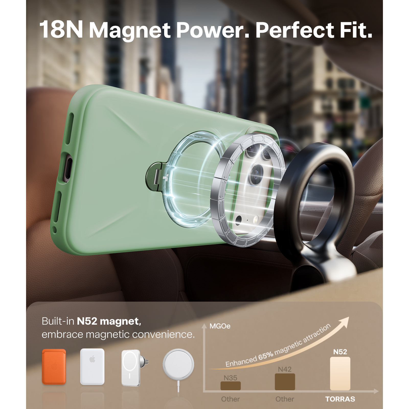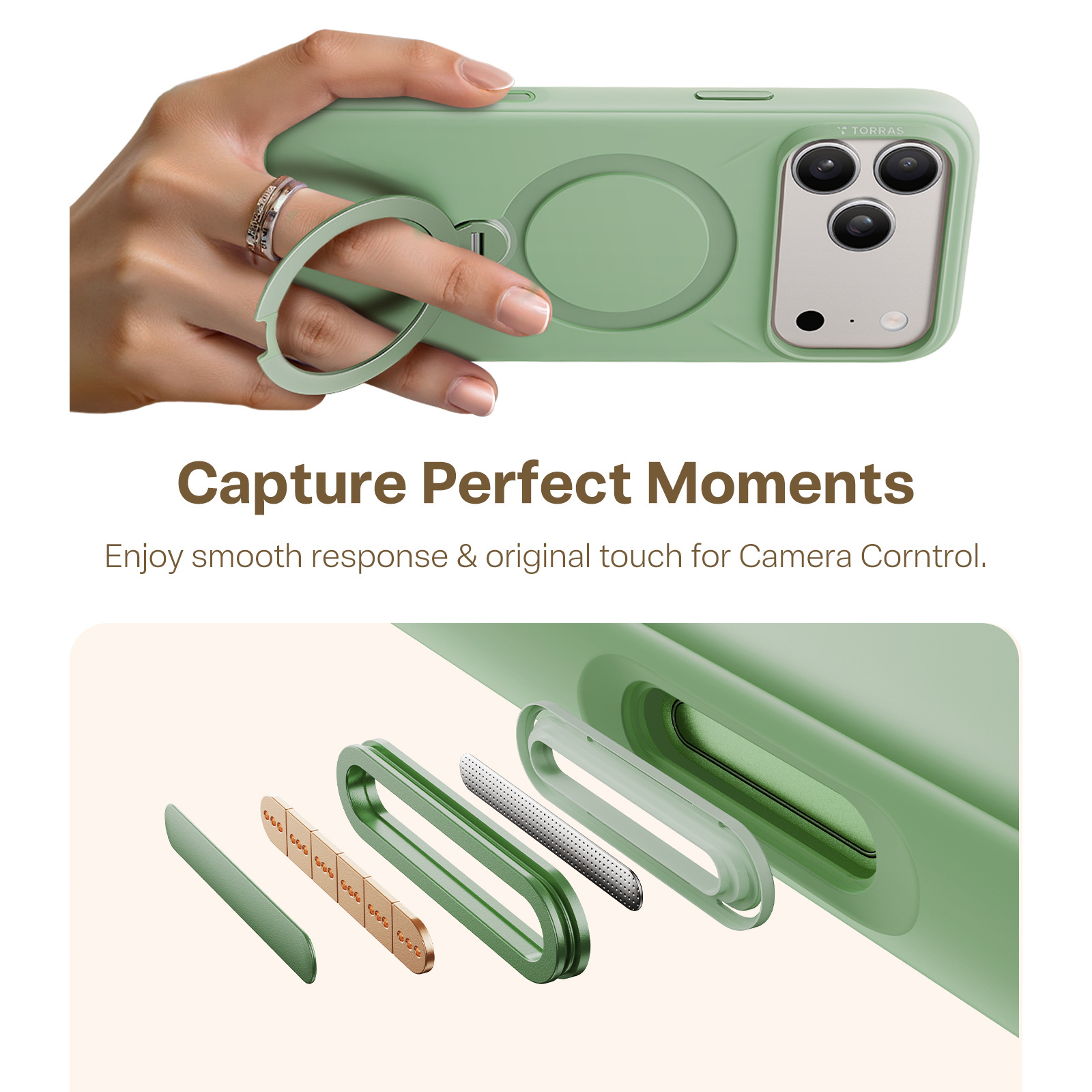 Torras iPhone 17 Pro Max (6.9") 2025 Ostand Spin Softune Case - Green Full Camera Control Button Coverage - Soft Liquid Silicone Cozy Grip - MagSafe Compatible - 360 Spin Kickstand