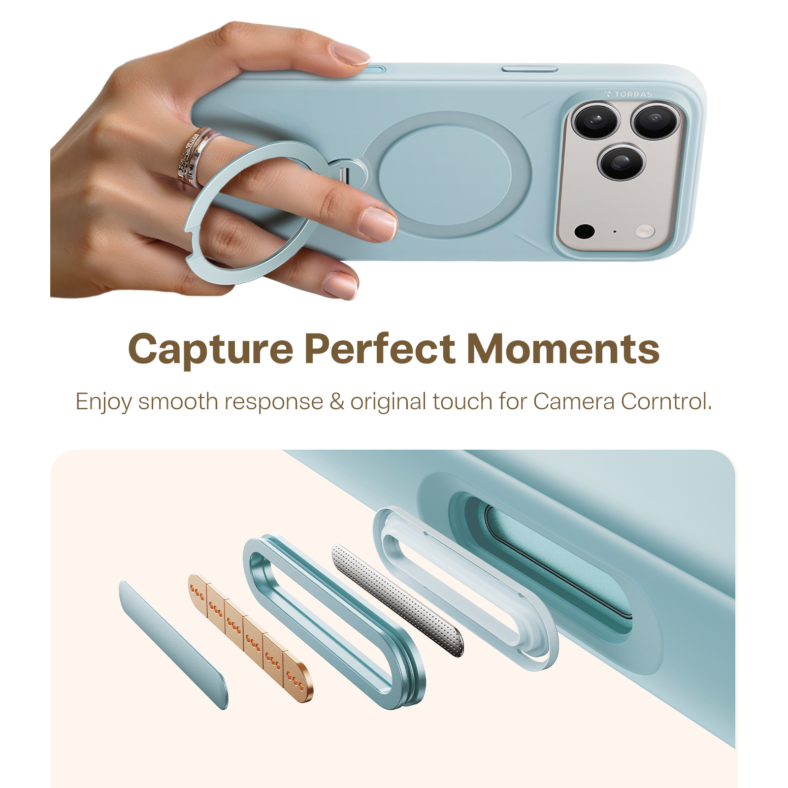 Torras iPhone 17 Pro (6.3") 2025 Ostand Spin Softune Case - Baby Blue Full Camera Control Button Coverage - Soft Liquid Silicone Cozy Grip - MagSafe Compatible - 360 Spin Kickstand