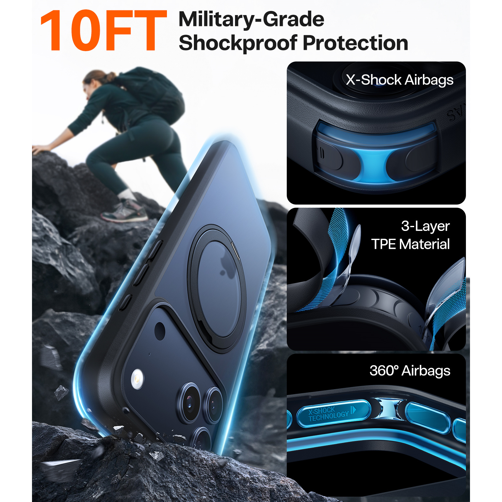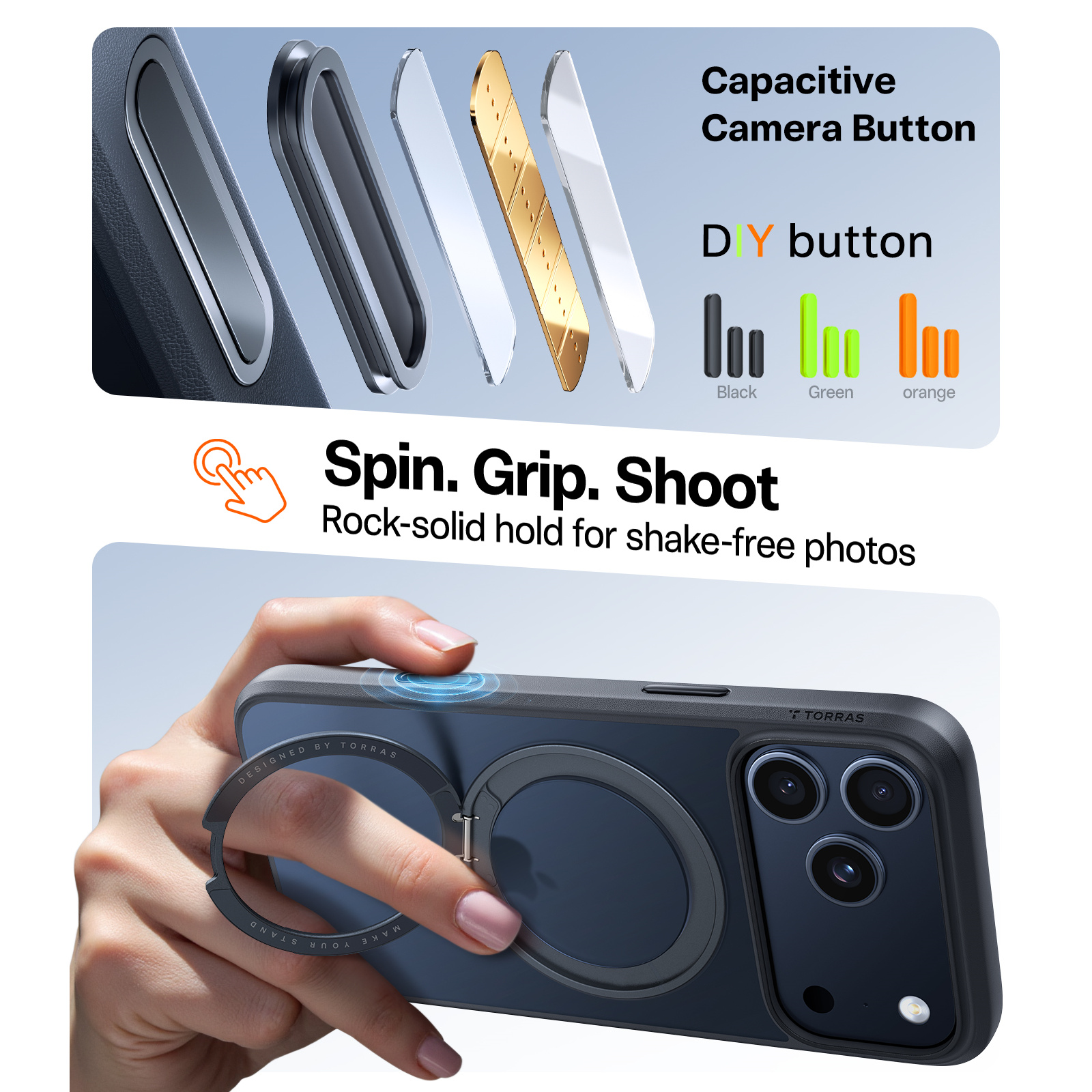 , Full Camera Control Button Coverage, MagSafe Compatible, Military Grade Drop Protection, MagSafe Compatible, 360 Spin Kickstand