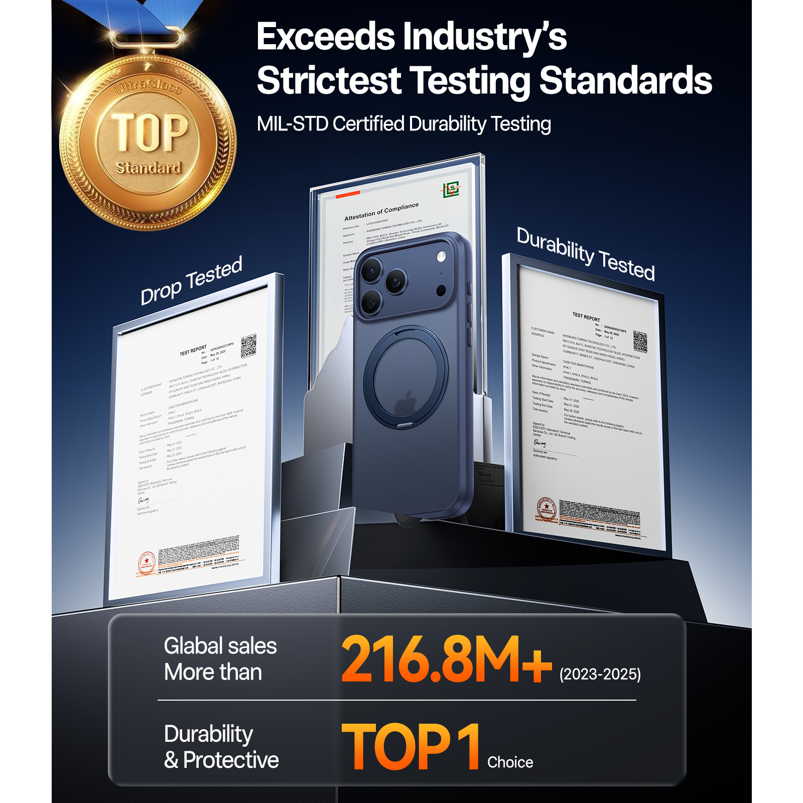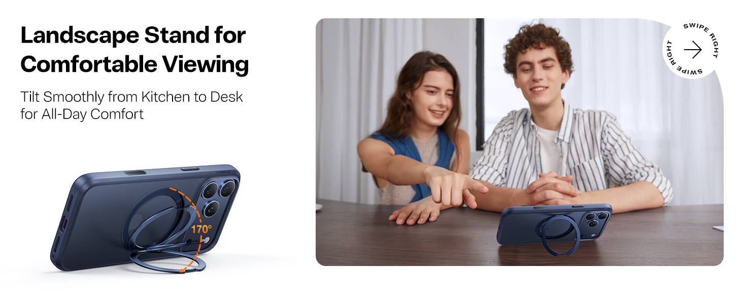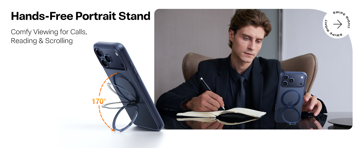 Work, video, play your way. Go seamlessly from hands-free Focus Mode to horizontal Fun Mode-perfect for Zoom calls, streaming, or propping up your phone at home or on the go. This slim magnetic stand case for iPhone 17 Pro keeps your setup lean while boosting your efficiency.The multi-angle ring stand has passed 30,000+ open-close tests for lasting durability.