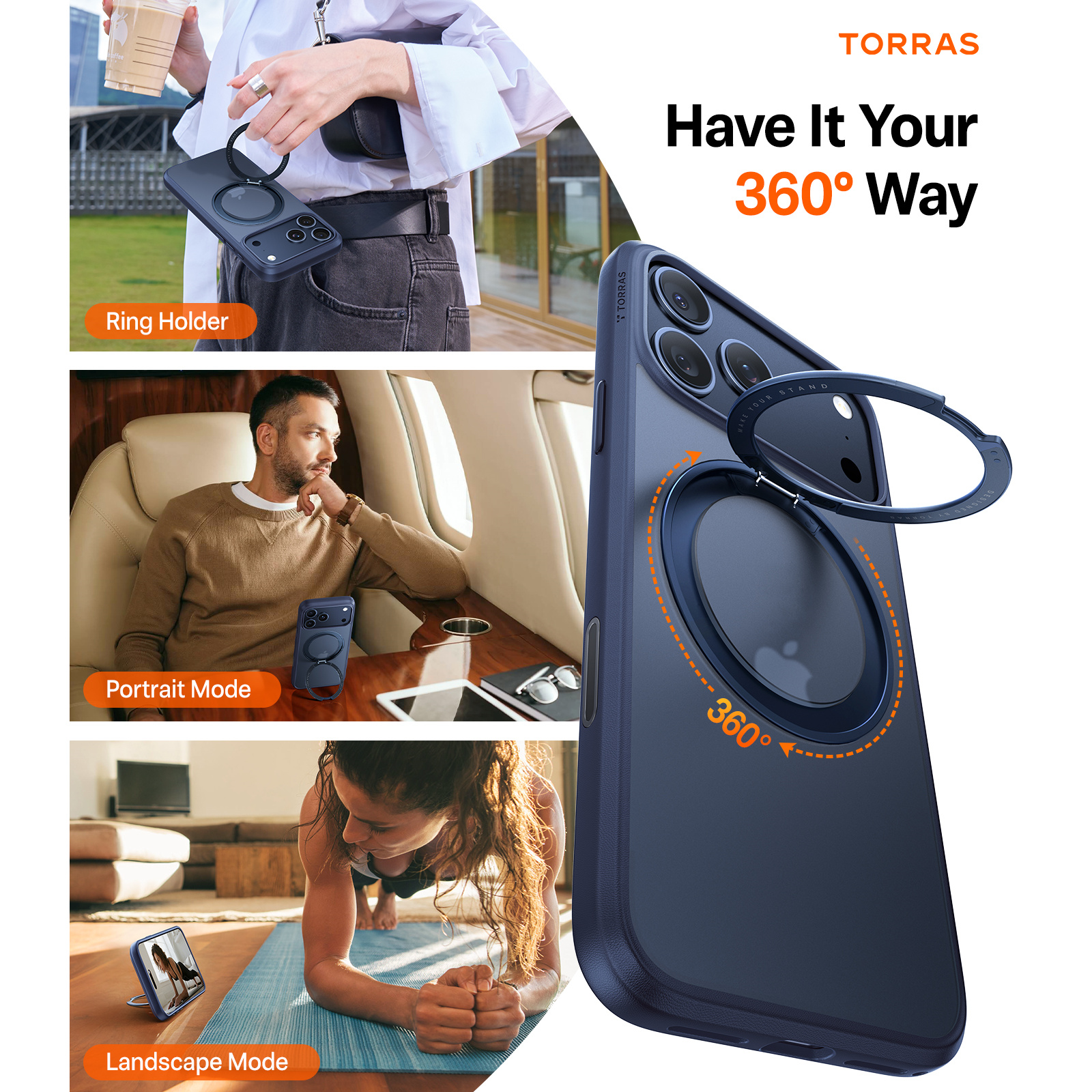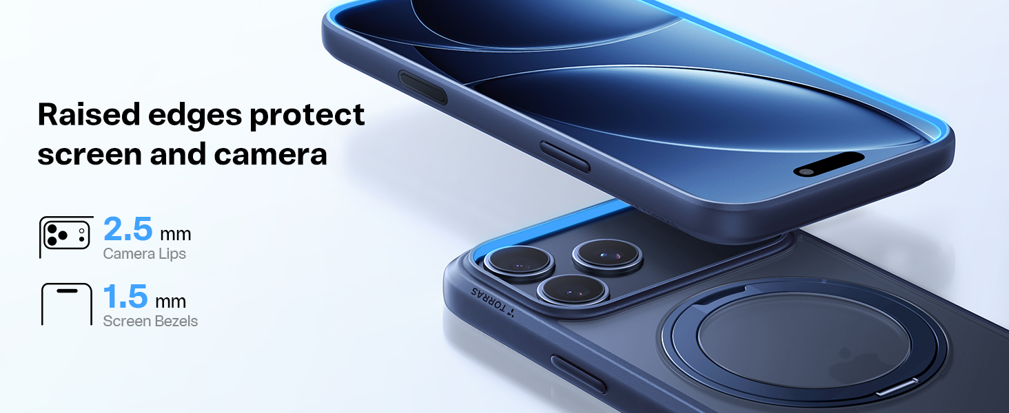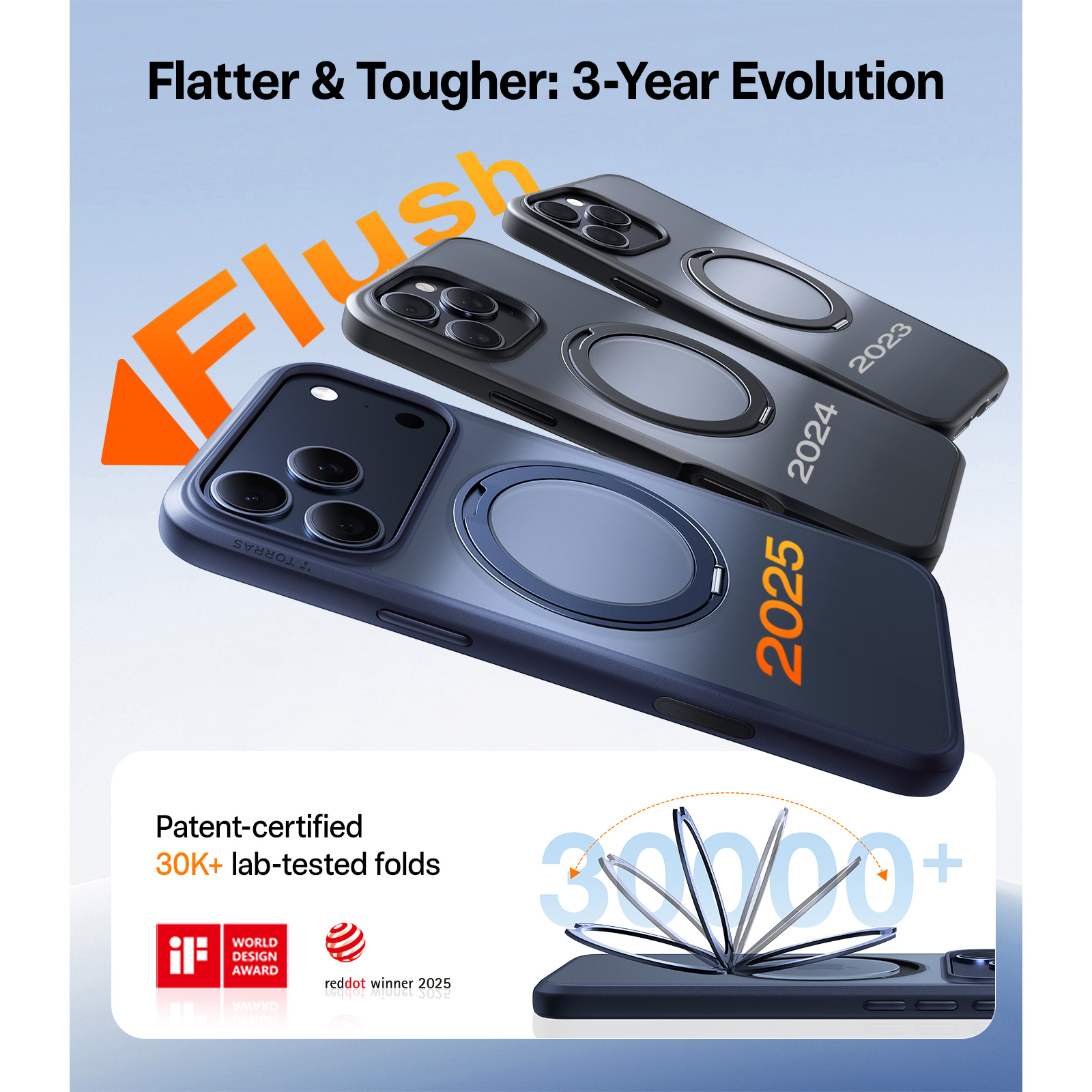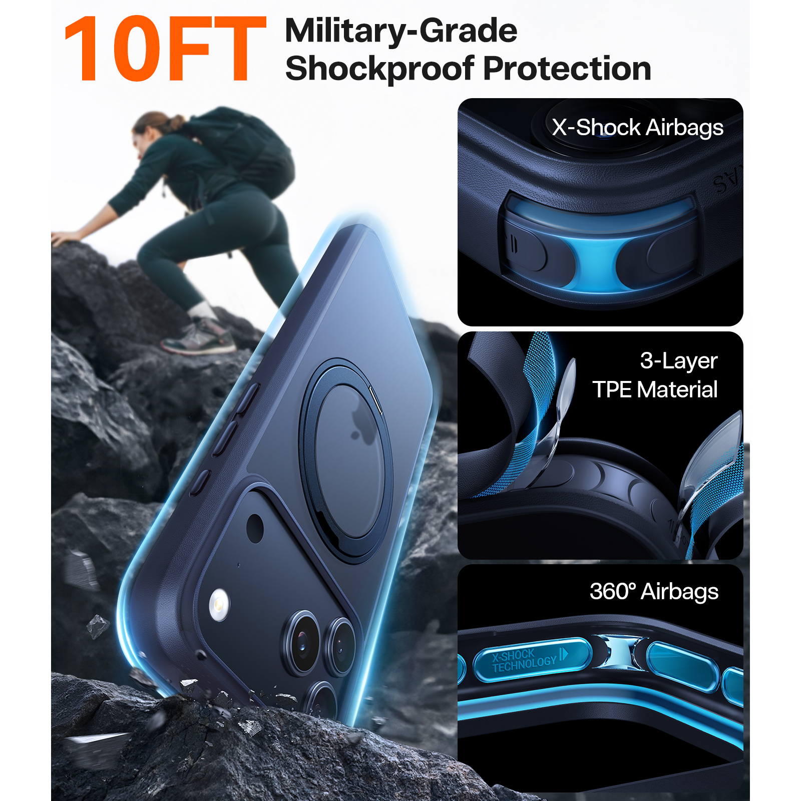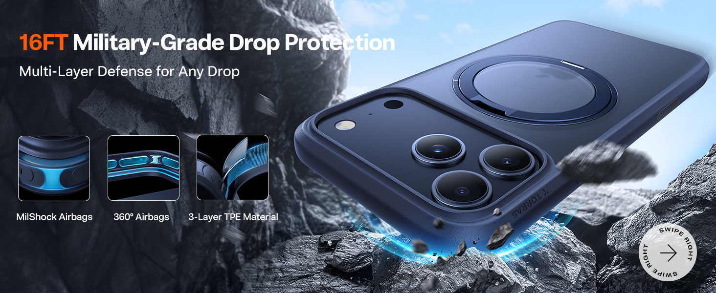 Engineered to handle life's surprises, this slim shockproof for iPhone 17 Pro case with kickstand features advanced shock-absorbing materials and a reinforced 4-layer TPU bumper that effectively disperses impact. It's built tough-surviving 10,000+ tests and 26+ angle drops with zero damage. With TORRAS patented X-Shock 4.0 corners, 4-ply cushion tech, and 360° raised lens airbags, your phone stays protected from severe drops and everyday bumps.