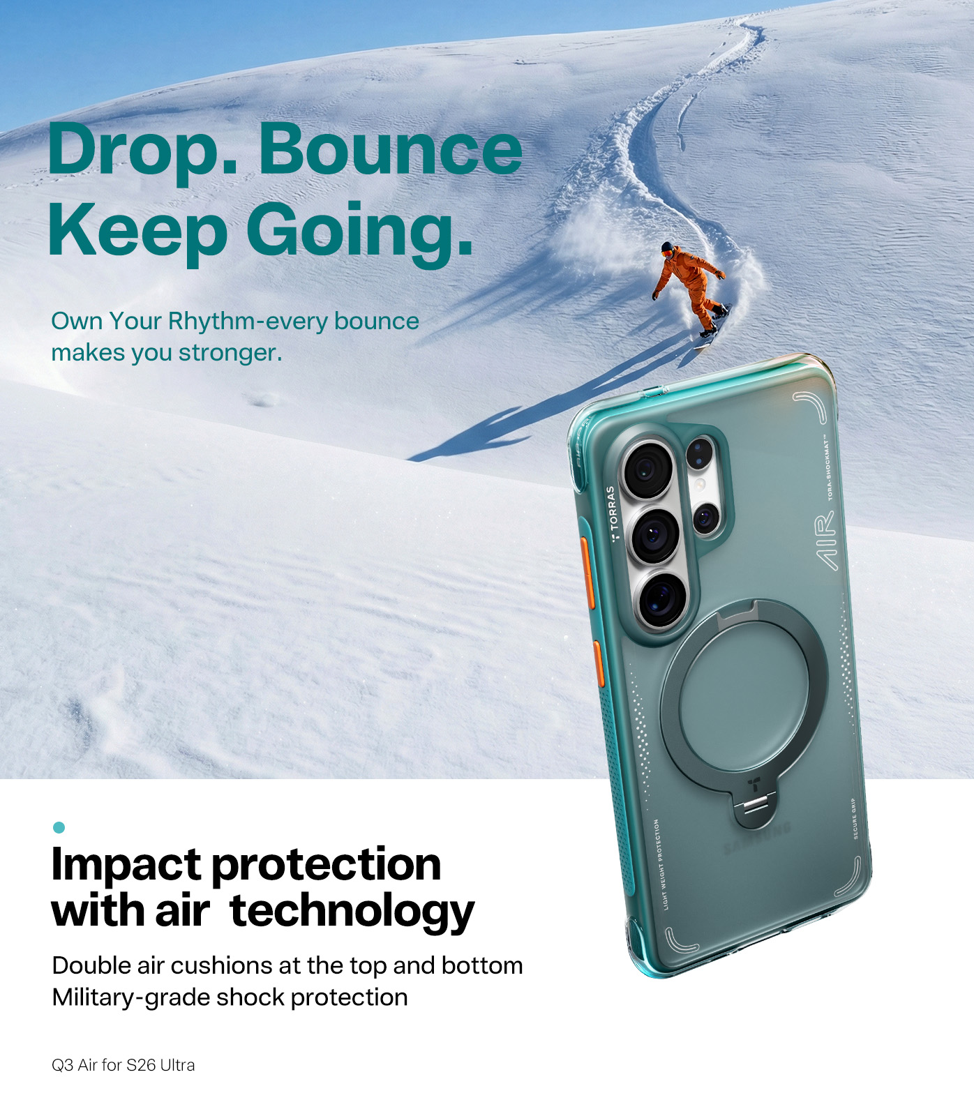 Torras Galaxy S26 Ultra Ostand Q3 Air Case - Glacier Green - Upgraded Airbag Technology - Dot-matrix Anti-slip Design - Compatible with MagSafe Charging - 360° Spin Stand