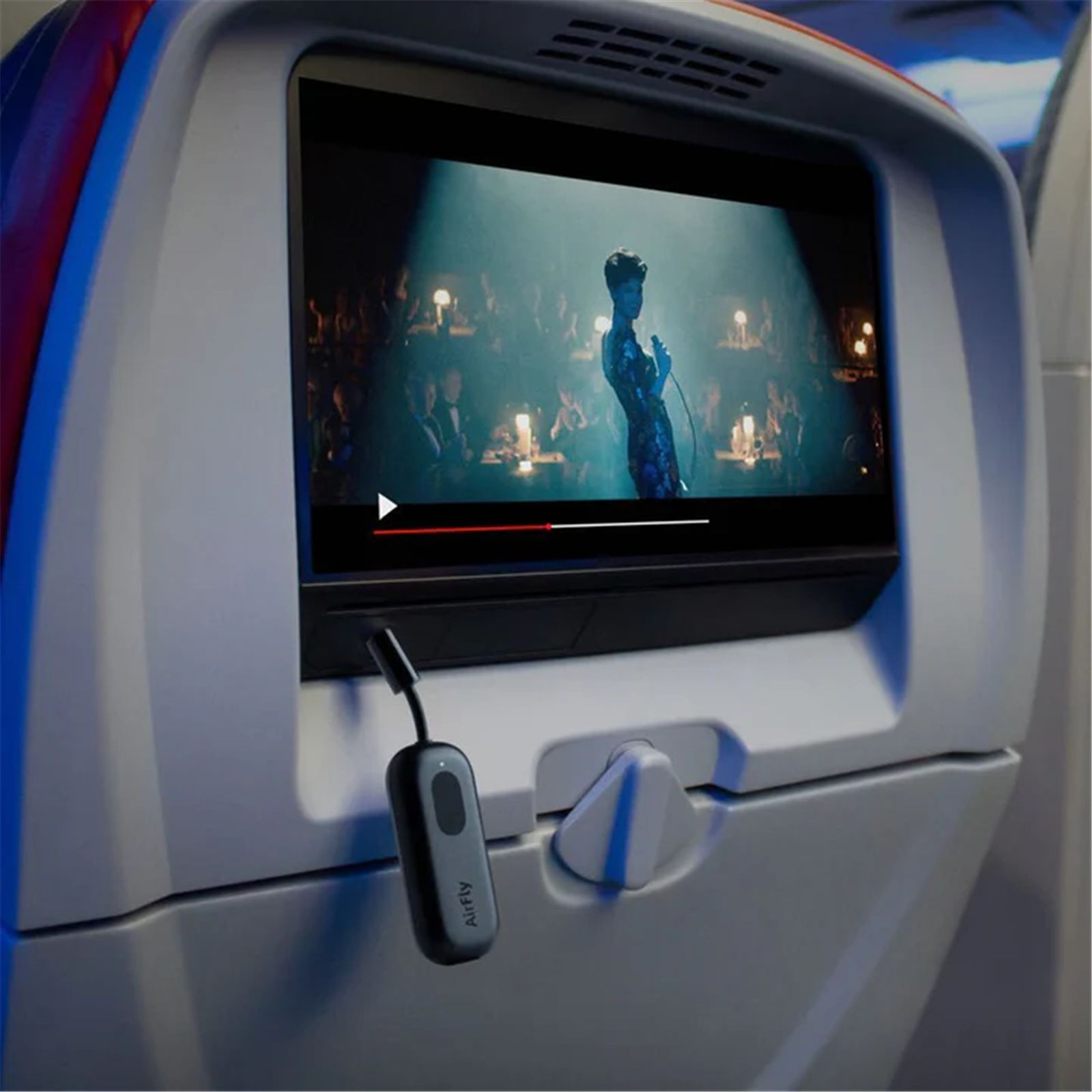 AirFly Pro is a wireless headphone adapter that lets you use your favourite wireless headphones or earbuds in places that only have a headphone jack - like airplanes and treadmills. Plug this tiny transmitter into a headphone jack to listen to in-flight movies or the TVs at the gym. AirFly Pro lets two people listen to the same soundtrack, podcast or music with their favorite noise-cancelling headphones or AirPods.