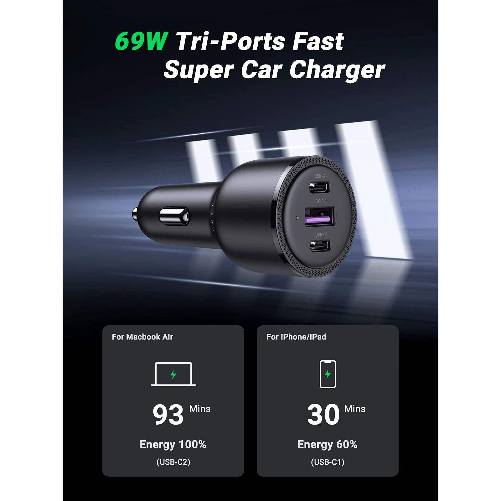 UGREEN CD239 69W PD Triple Port Car Charger 2x USB-C & USB-A - PD3.0 65W + QC3.0 USB-A - Compatible with iPhone 15/15 Plus/15 Pro/15 Pro Max/ 14/13/12/11/iPad/Mac Book - Galaxy S22/S21/S20/S10/Note 20
