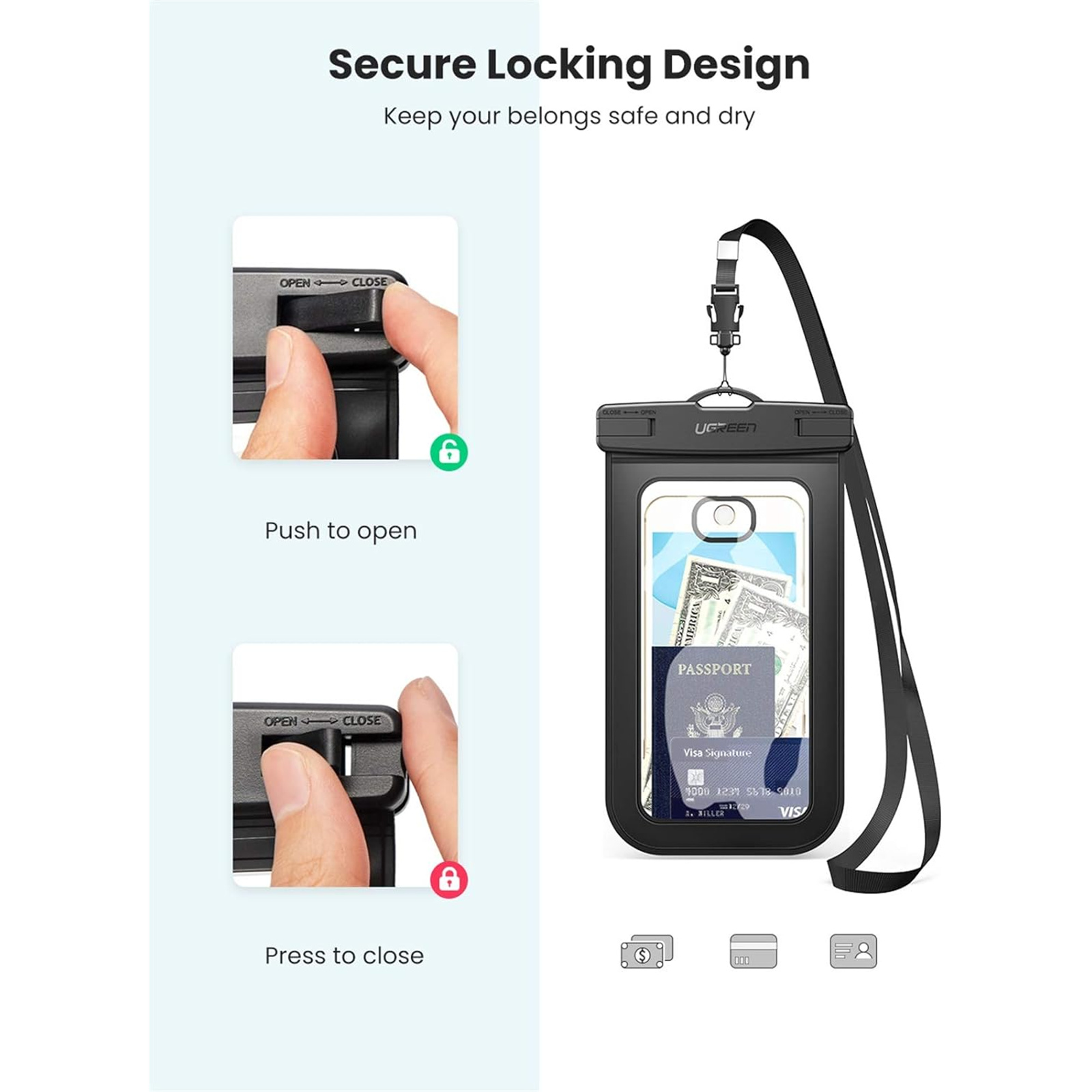 UGREEN Waterproof Phone Pouch Case - Universal up to 6.7-inch mobile phone - IPX8 level Waterproof Depth: Up to 20m/65.6ft - Lanyard Length: 49cm/19.3in.