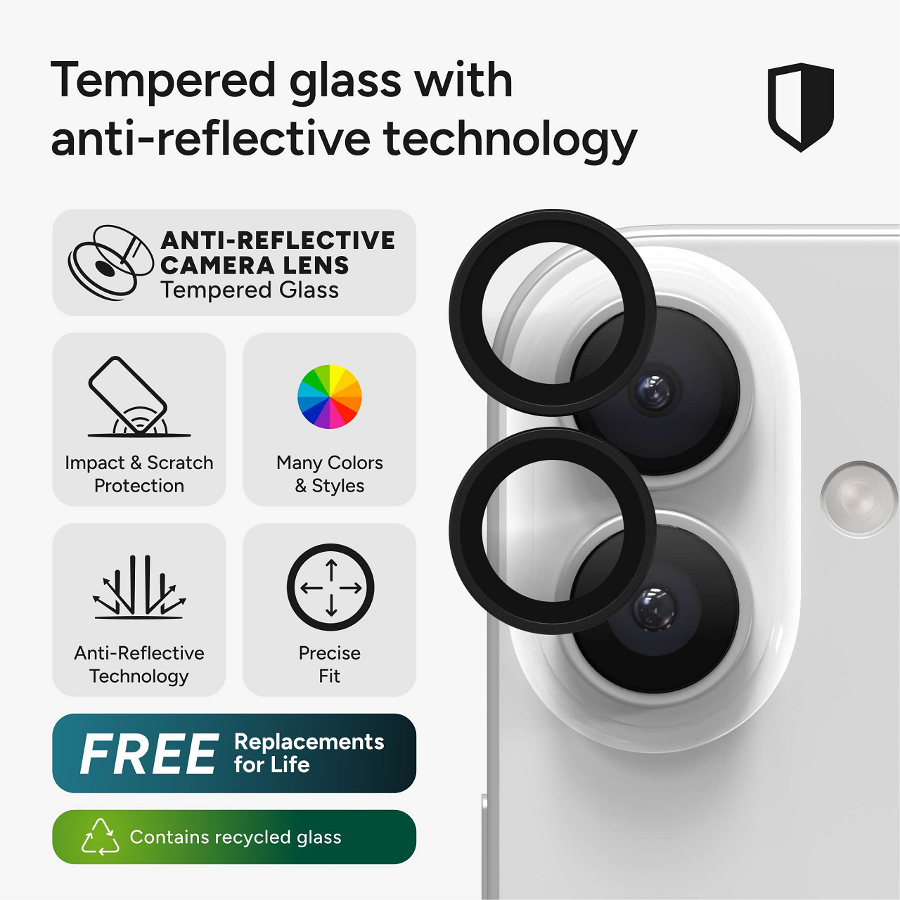 Anti-reflective, tempered glass lens protection
