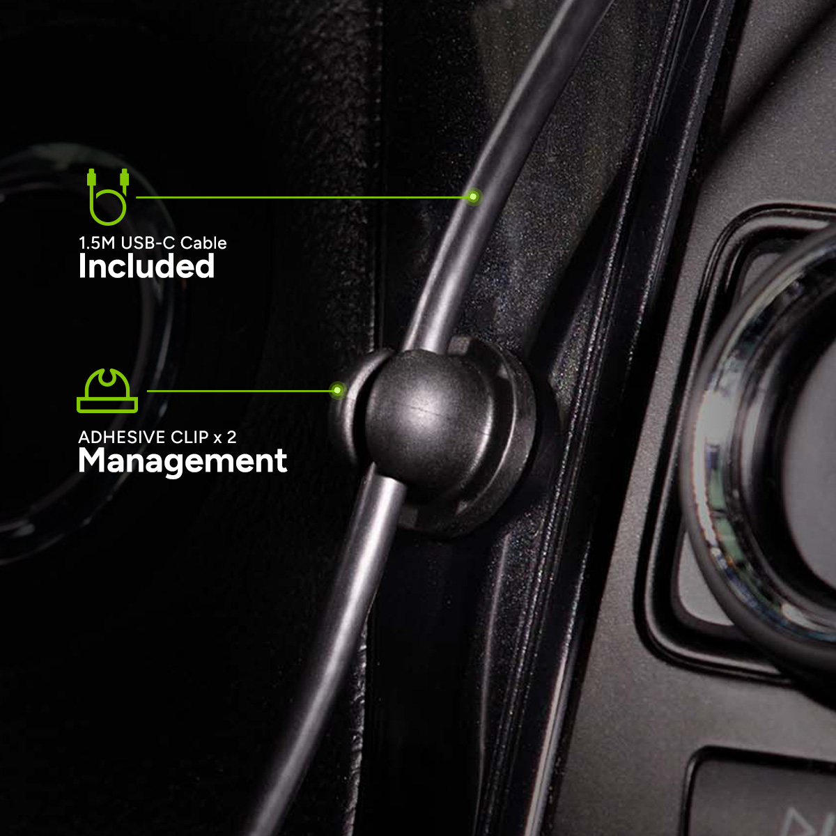Two adhesive cable management clips are included to help keep cables out of your way while you drive.