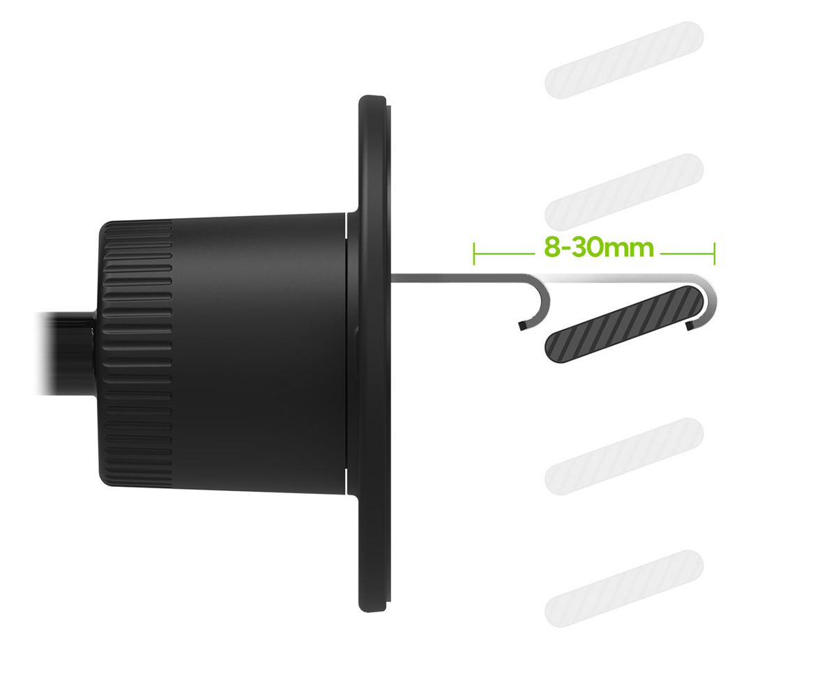 The vent mount's hook can be adjusted 8-30mm. The hook twists into a locked position for a secure hold.