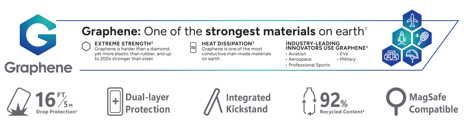 This dual-layer case is strengthened with Graphene, one of the strongest materials on earth. We've added an integrated kickstand, for easy viewing, that folds back flush with the case when it's not in use. The adventure-ready Denali Snap with Kickstand case gives you peace-of-mind protection. And it's made with up to 92% recycled content, so you can feel good about your case purchase too.