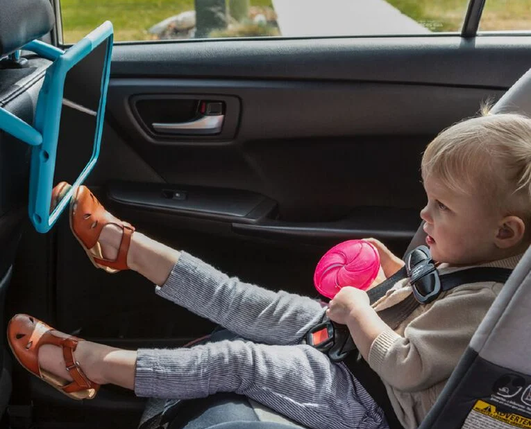 Each arm rotates 180º and can be used to carry the tablet or hang it from the headrest of a car seat for easy, hands-free viewing.