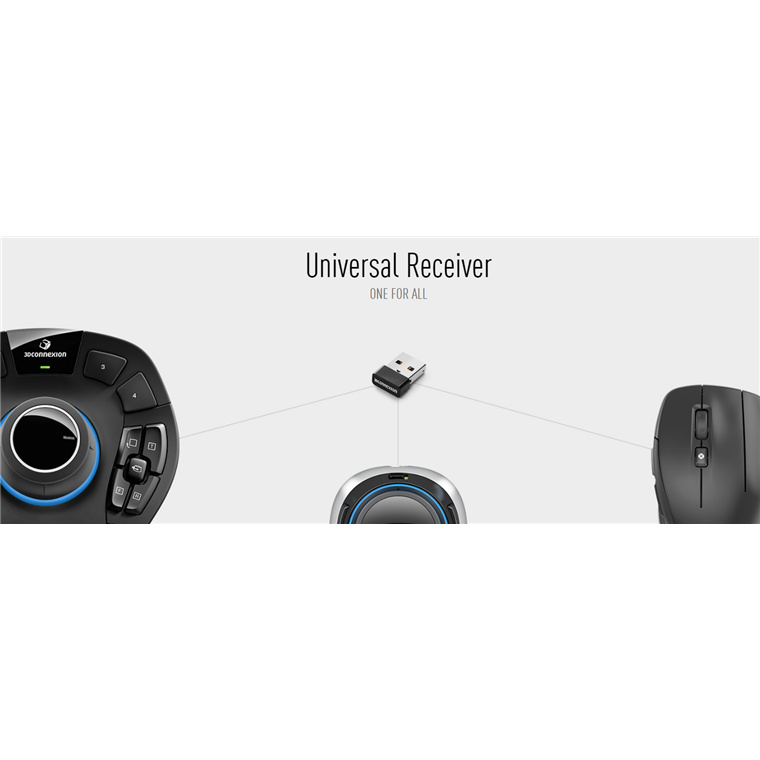 The 3Dconnexion Universal Receiver is the solid link between your computer and up to five 3Dconnexion wireless products. With only one small USB receiver you can easily pair any 3Dconnexion product for a reliable, wireless connection.
