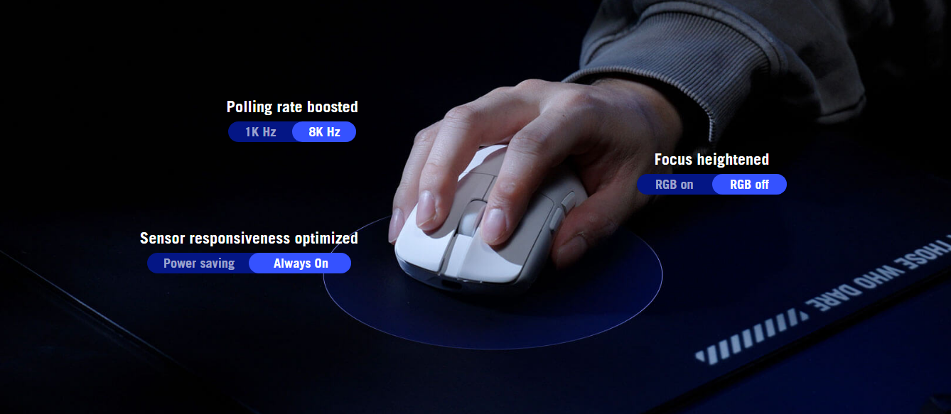 - ROG SpeedNova 8K wireless technology: Experience maximized precision and reliability at up to 8KHz polling rate with ROG SpeedNova 8K wireless technology.