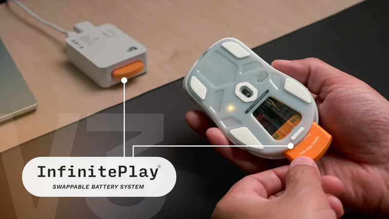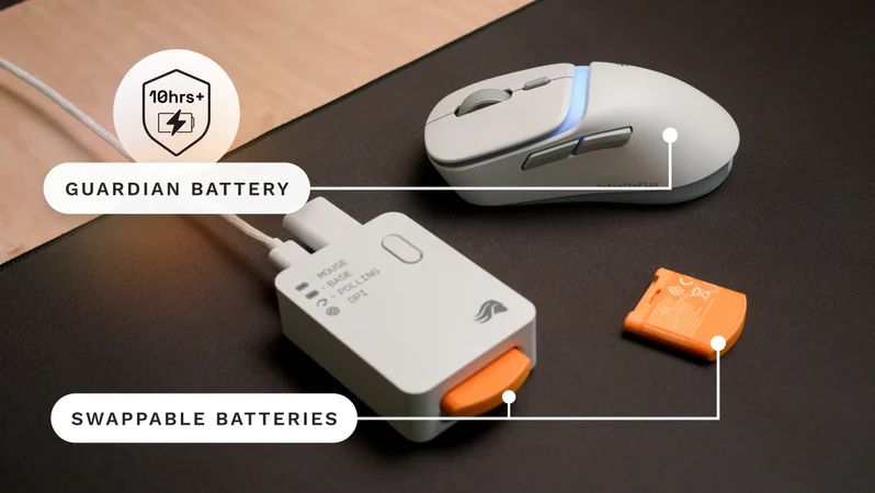 Hotswap between 2 batteries for unlimited play, while the Guardian System keeps you connected to the 8K Hz dongle, which doubles as a charging hub.