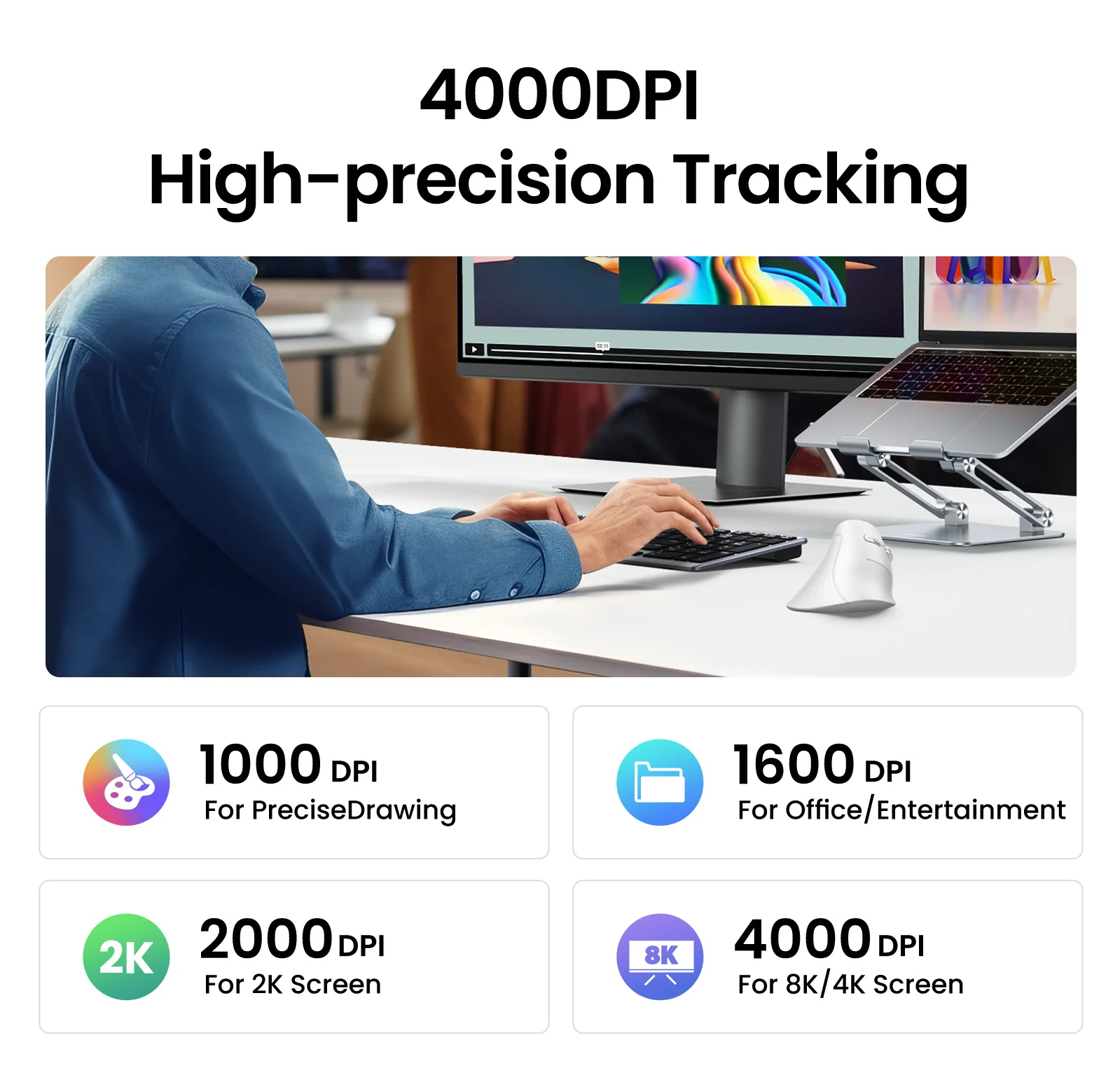 UGREEN UG-45759 Vertical Ergonomic Mouse, Bluetooth & 2.4G, Silent Quiet Clicks, 5 Buttons, 4000 DPI & 4 Adjustable DPI, for Laptop, Mac, Chromebook, PC, Windows, White