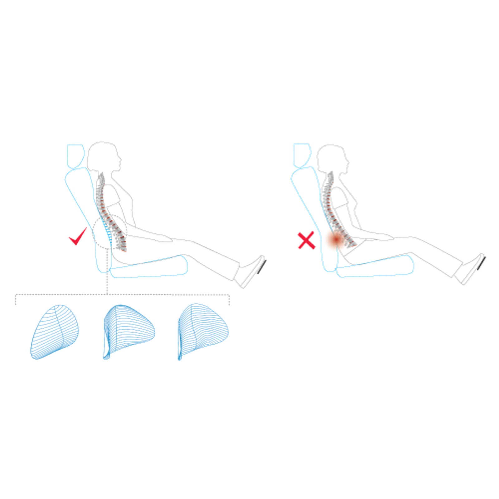 If your car seat doesn't support your 'neutral' standing posture, your spine will slump backwards into the seat, eventually leading to back stiffness and/or pain. A portable lumbar support can correct your posture and prevent pain- but only if it's the right shape to fill the exact gap between your seat and your back.