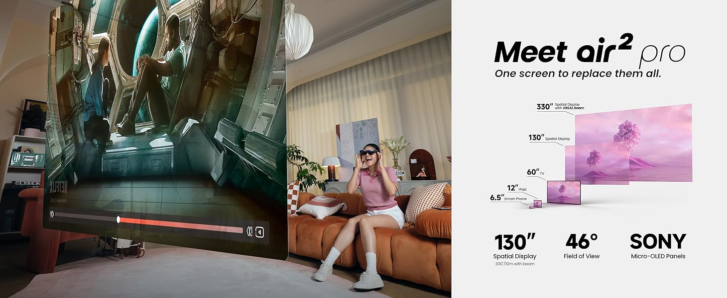 Xreal Air 2 Pro AR Gleasses, Equipped native 3 Dof, 46 Degree FOV, Latest 0.55 Micro-OLED Panel from SONY, Up to 120Hz (2D mode 120 Hz, 3D mode 90Hz) 1920*1080 Pixels Per eye, Unit-based Colour Calibration. 75g