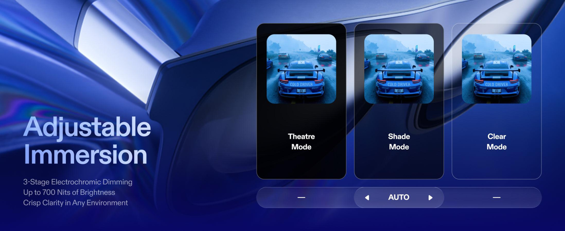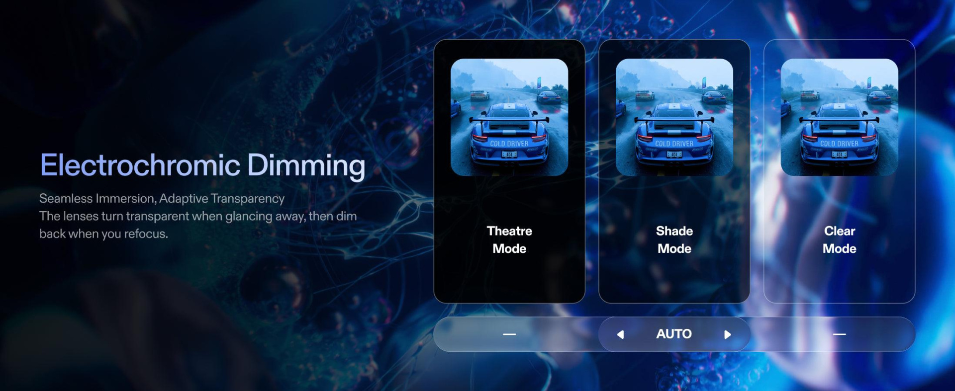 Comfort isn't just a feature of 1S - it's foundational. The lenses are TÜV Rheinland certified to reduce flicker, glare, and reflections, ensuring clear visuals with less eye strain. The 1S can automatically adjust lens tint: look away and the lenses turn transparent so you can see your surroundings, then they dim again when you refocus on content. This means perfect clarity in any lighting and easy transitions between virtual content and real-world awareness.