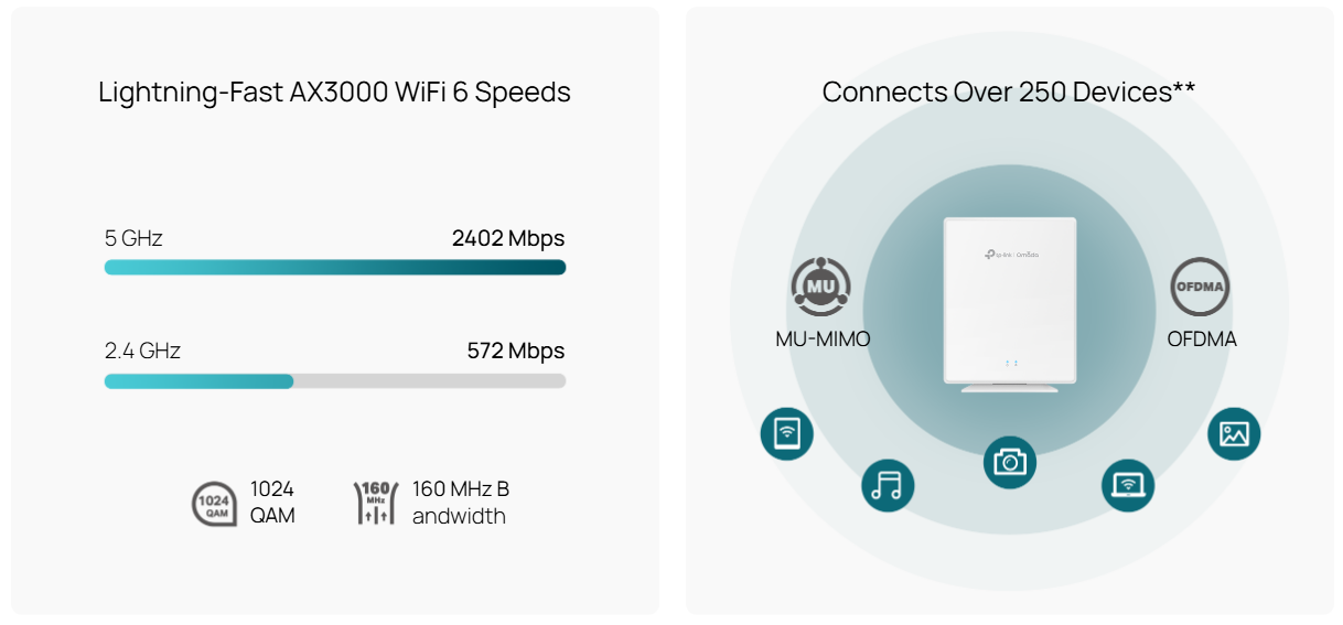 Blazing-Fast AX3000 WiFi 6 Speeds: 574 Mbps on 2.4 GHz and 2402 Mbps on 5GHz totals 2976 Mbps WiFi speeds[1].