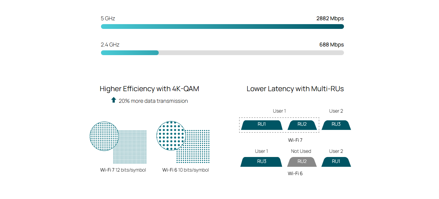 - BE3600 Wi-Fi 7 (2882 Mbps on 5 GHz + 688 Mbps on 2.4 GHz).*