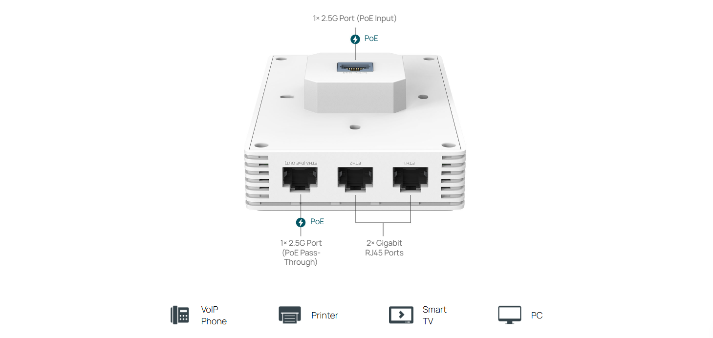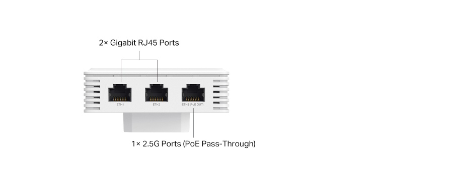 Downlink: 1× 2.5G Ethernet Port + 2× Gigabit Ethernet Ports (The 2.5G port supports PoE pass-through. The PoE pass-through feature requires 802.3at/bt input.)