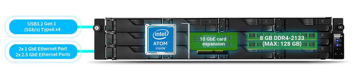The ASUSTOR Lockerstor 12RD rackmount series prepares you for the needs of tomorrow. PCIe expansion enables 10-Gigabit Ethernet can be installed to increase performance and expandability. Combine the Ethernet ports and connect to a 2.5-Gigabit Ethernet switch to take advantage of extreme speeds. Break free from restrictions with the Lockerstor 12RD.