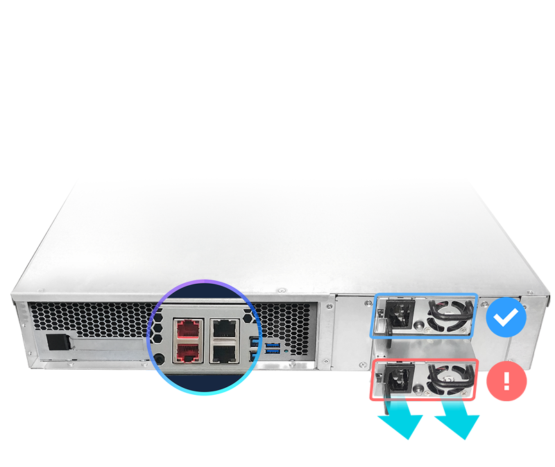 The Lockerstor 12RD has complete backup and safety mechanisms by including dual backup power supplies for safety while including four Ethernet ports for additional performance and redundancy. Two Gigabit and two 2.5-Gigabit Ethernet ports adorn the rear of the NAS, ensuring that everyone can access their files quickly and efficiently. The Lockerstor 12RD makes no sacrifices by ensuring zero downtime if a port or power supply is offline.