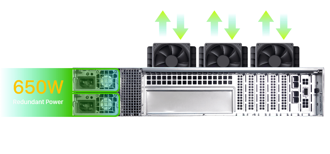 The Xpanstor 12R is equipped with two 650W redundant power supplies and three hot-swappable fans, which increases overall operational efficiency and fault tolerance. Both power supplies can automatically switch to the other in the event one fails, ensuring continuous operation and data security. The hot-swappable fan design allows for fan replacement without downtime, effectively reducing maintenance and upgrade costs.