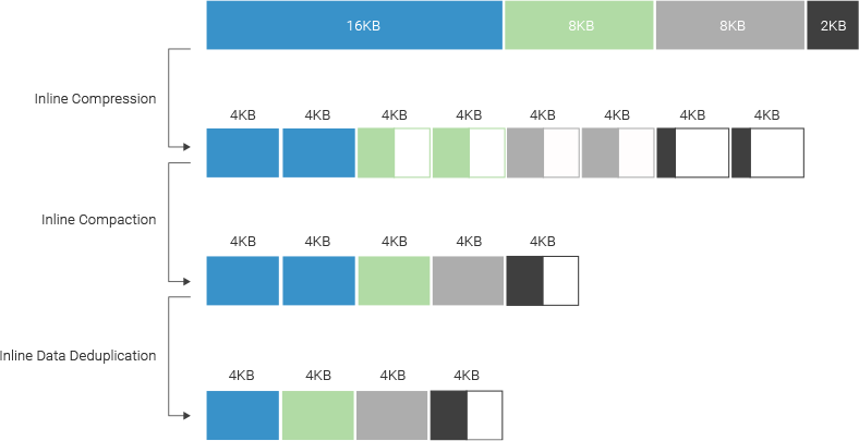 Inline data deduplication, compression, and compaction reduce file sizes to conserve storage capacity and optimize performance.